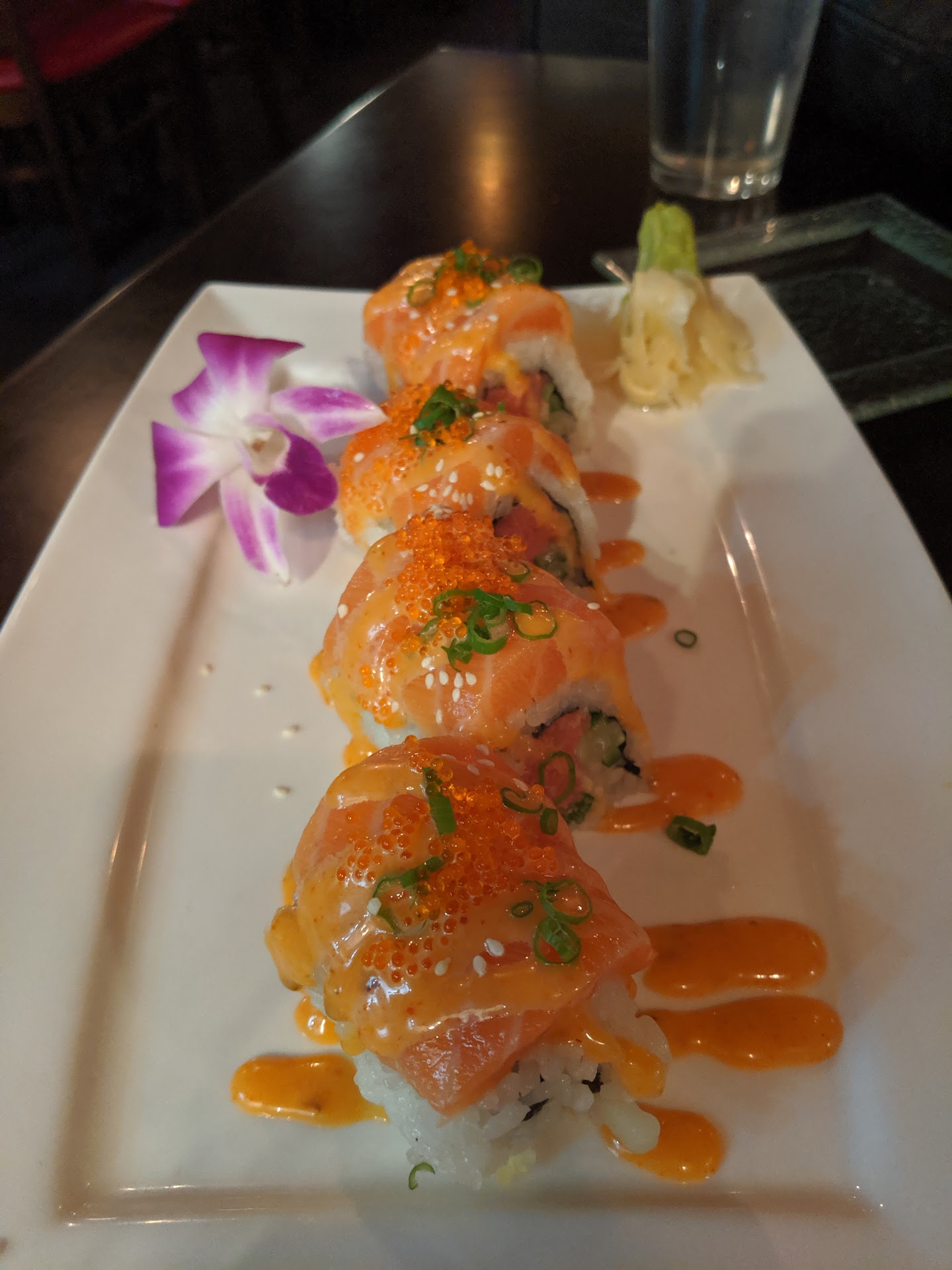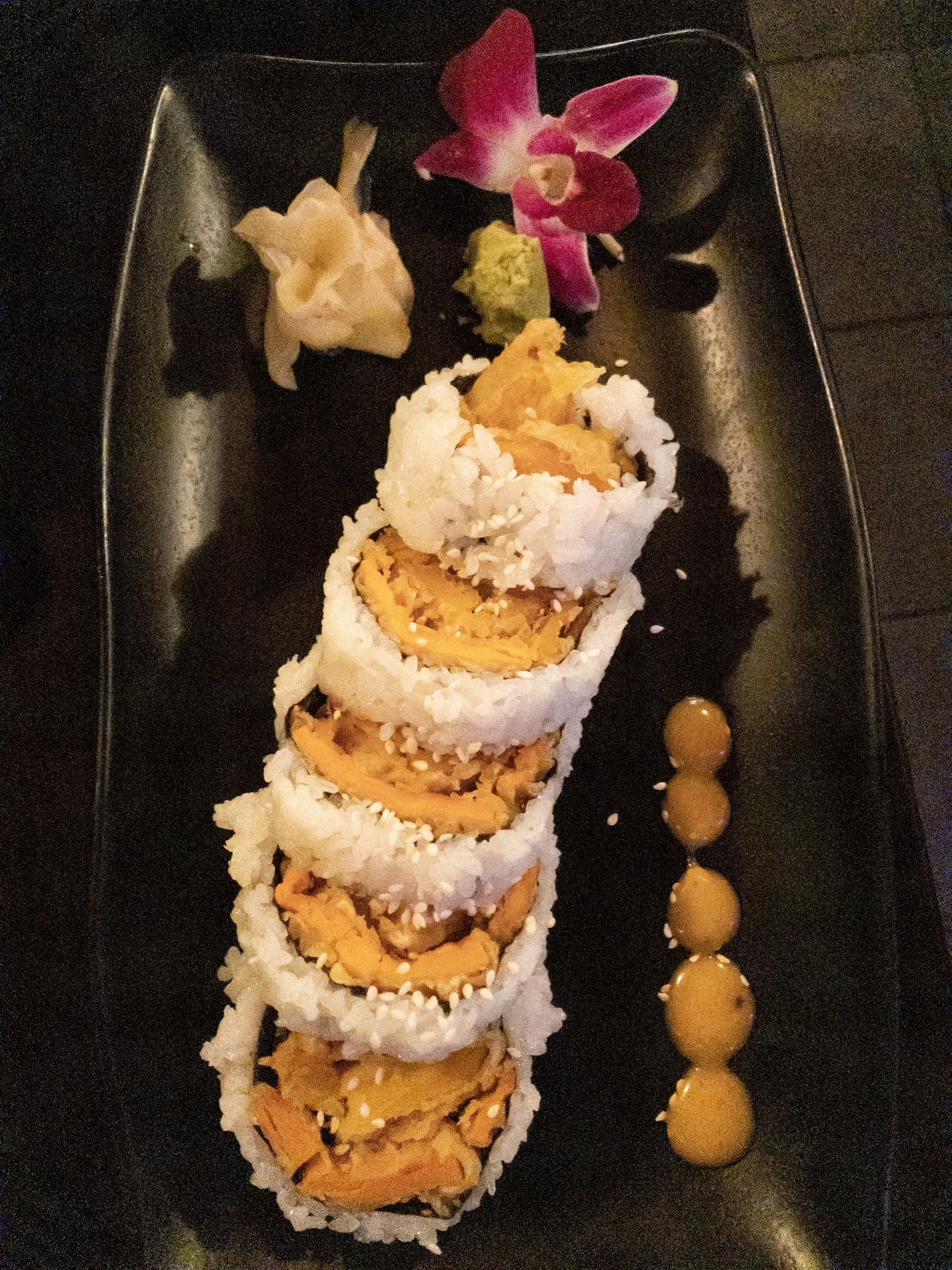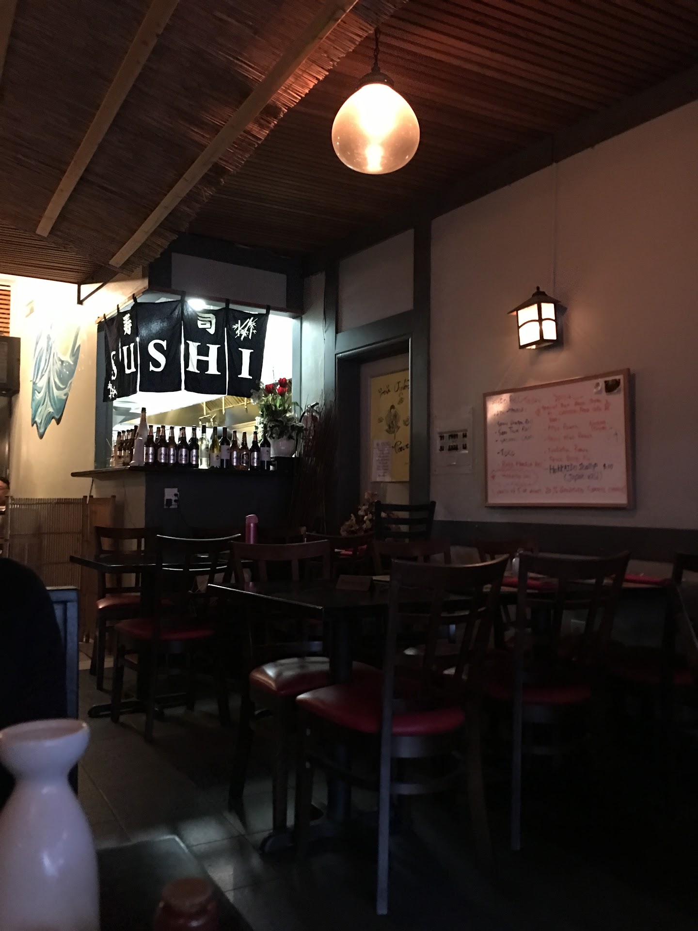The boyfriend and I ordered hot sake, scallops and tuna tartar, and three different rolls of sushi. We were also given free vegetarian egg rolls while we dined. We enjoyed the three different rolls of sushi. They were not too big, where you couldn't eat it but not too small either where you feel like, I'm paying how much for this little piece? It wasn't bombarded with sauces and it wasn't bland either. I approve and will come back for the variety of rolls offerred.
