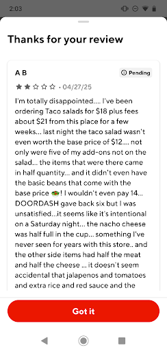 I reported everything to DOORDASH and it has you take pictures within the app but it doesn't save those PICTURES. So I was not able to add them to their review system, or here-