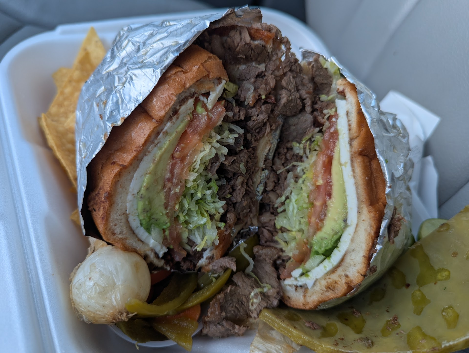 Read moreReview update 2/17/27: ordered a torta (sandwich) for the first time here, thought I'd try to incorporate some veggies into my body this visit with the lettuce, tomato and avocado that comes with the torta! It's a big, messy sandwich that gave me instant food coma. Verdict? 8.9 outta 10! Nothing takes the place of their tacos, but the torta is a solid choice and big enough to split with someone! They slather both sides of a big bun with mayo, lay it on the flattop to heat up and 'toast' up while they chop your protein choice and slice up your avocado. A mild, slightly nondescript slice of cheese gets slapped on the bread before everything else goes on: lettuce, tomato, onions if you want, then the meat. Into a box with chips, those lovely griddled baby onions and My favorite, some slabs of cooked nopales (cactus paddles) and you have yourself a crazy fulfilling meal, and then some!
