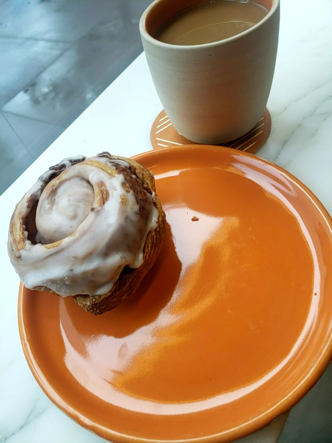 I also ordered two pastries, which were very good and tasty but the cinnamon roll was hard and seemed like it should have been previously warmed up before serving.. The texture was extremely hard and the cinnamon taste was missing. Good with the caffe but not great.