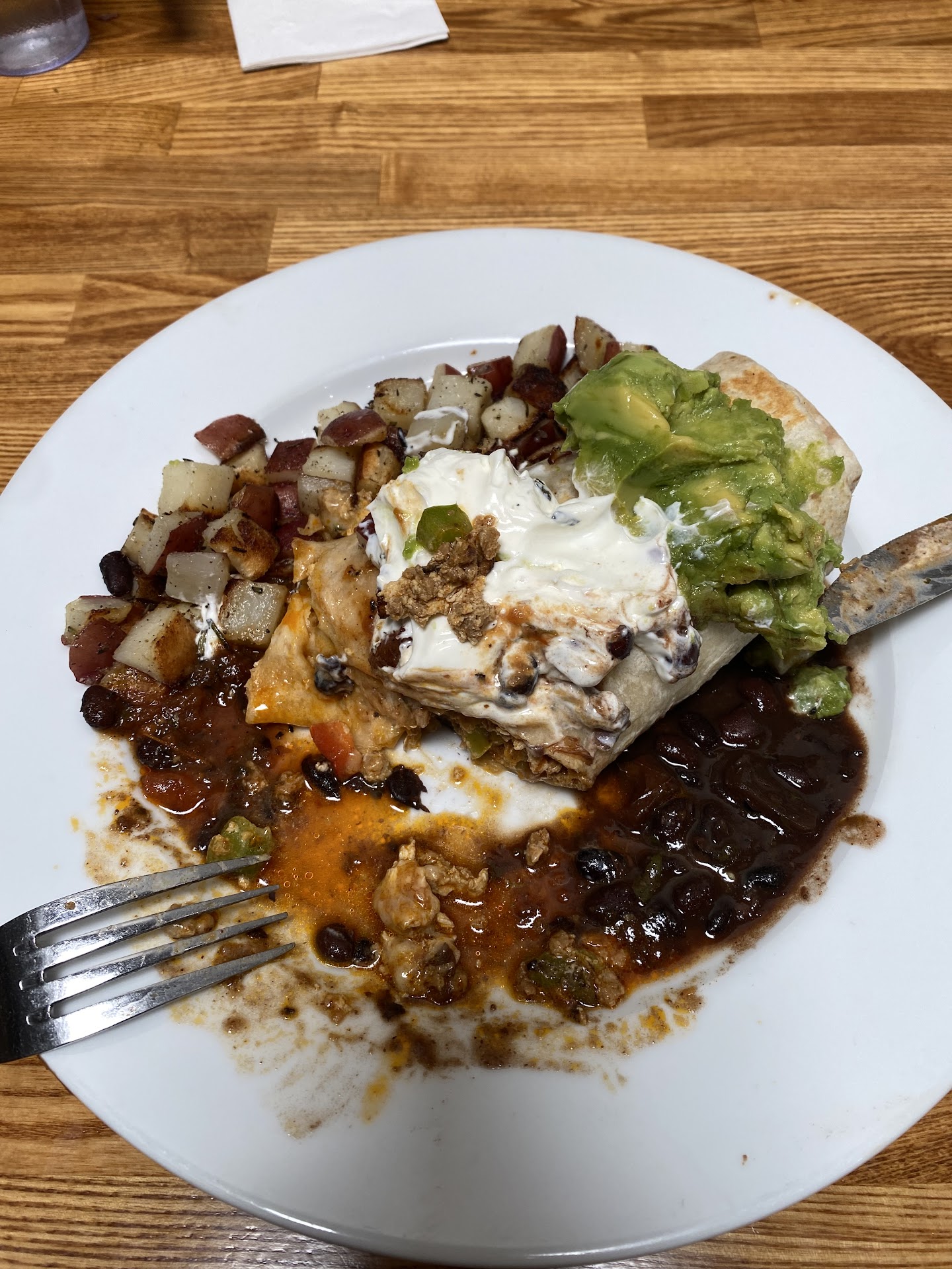 Read moreI pleasantly enjoyed the Bombay Crepe with a straight greens ( 2 servings spinach and sparse kale ) salad along with chicken, grilled onions, curry, small perfectly boiled potatoes(which are one of my favorites), and mushrooms instead of Bell Peppers ( which cause me to break out in Hives ) in a savory soft crepe fold. The sweet potatoes fries were over cooked and limp unlike at Barney's up the street — however if you are looking for a healthier option than a Burger, CrepeVine is a great place: