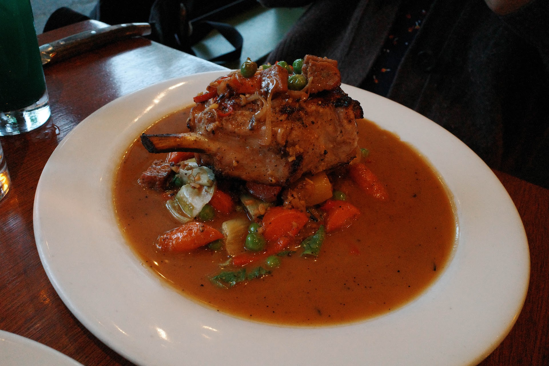 Read moreThis place justified its popularity. The atmosphere is friendly, with the bartender Wes being an affable host who recognized and chatted with a surprising number of customers seated to either side of me. It was so relaxed that I found myself in multiple conversations with my neighbors at the bar. I started with the smoked duck charcuterie board and thought it was a great opener, perfectly portioned. If I had to level one criticism it would be that the crostini was a bit thin and thoroughly crisped throughout, where I would prefer a softer center. For the main course I ordered the much praised pork chop, which came in a sweet marsala cream sauce. It reminded me a bit of the pairing of apple and pork with its savory sweetness complimented by thick bits of deeply colored bacon and brightly colored peas, carrots and potatoes lending texture and color to the plate.