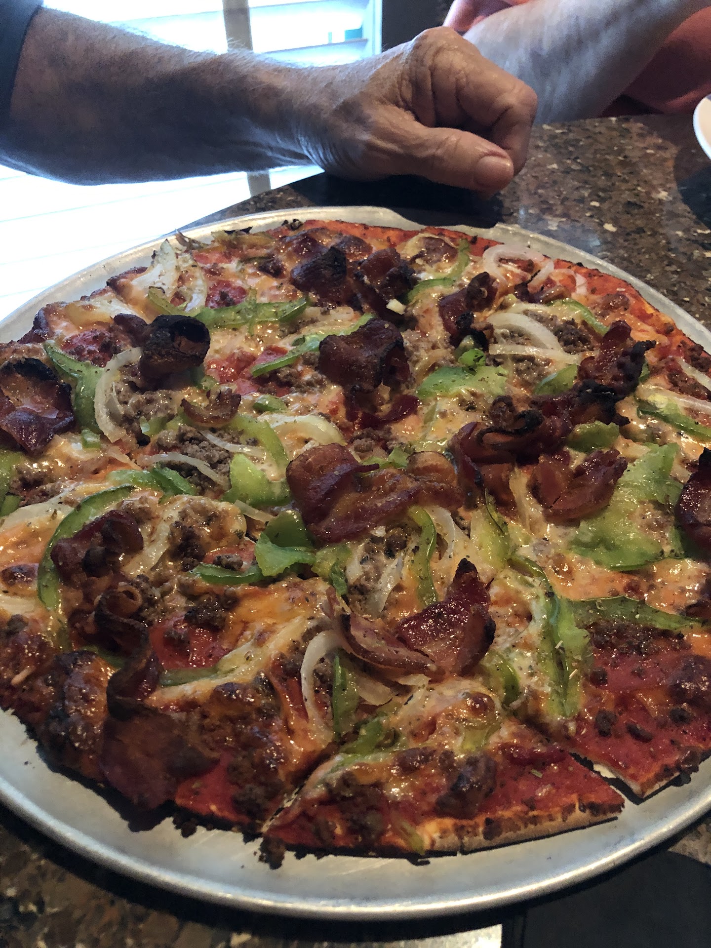 Friend #1 got the 12” Frank’s Special Delight pizza which had hamburger, pepperoni, big pieces of bacon, onions and peppers. I did not have any, but my friend sure liked it! It did look amazing, I will say.