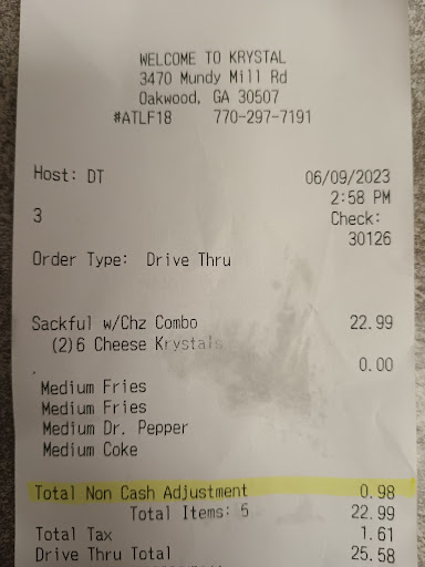 Read moreI love Krystal and eat there fairly regularly. But, I’m taking a break until they decide to start giving you what you pay for. I ordered a medium order of fries and my photo would imply they gave me a small order that was only half full. I already pay the increased prices (not their fault), but don’t add shrinkflation to the mix and cut the portion as well. The next time I visited I ordered a large fry. It was nearly $3 and they still only filled the box half way. I’ve encountered a couple of really nice staff there, but I have also experienced some rude staff that would imply that you are inconveniencing them and I wouldn’t dare tell them to fill up my fries. It just easier and less trouble to spend my money somewhere else.