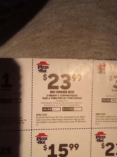 I took my elderly parents on 7/15 for the lunch buffet. We got there right at the prime time of lunch around noon. The sign stated wait to be seated. We stood there for a few minutes and there was one girl who said take a seat and I'll be with you in a couple minutes. She was working the register the dining room and everything else it seemed to like. I felt bad for her. About 15 minutes later she comes over and asks are we dining in or the buffet. I stated the buffet and she said go ahead and get your food I'll bring silverware and drinks over. We got our food and that it was getting cold so I went up to the register to ask for silverware. She was busy ringing people out. The salad bar was empty what she said she would restock. There was no new pizzas or pasta or breadsticks brought out the whole time we were there the food was old and nasty. By this time it was around 1:00 and I asked if she would be bringing a fresh pizza out. Her response was oh we don't do that after a certain time. $37 for 3 people who had crappy service, food and no refills on drinks. Haven't been there in a few years but I guess Pizza Hut is not the same. I...