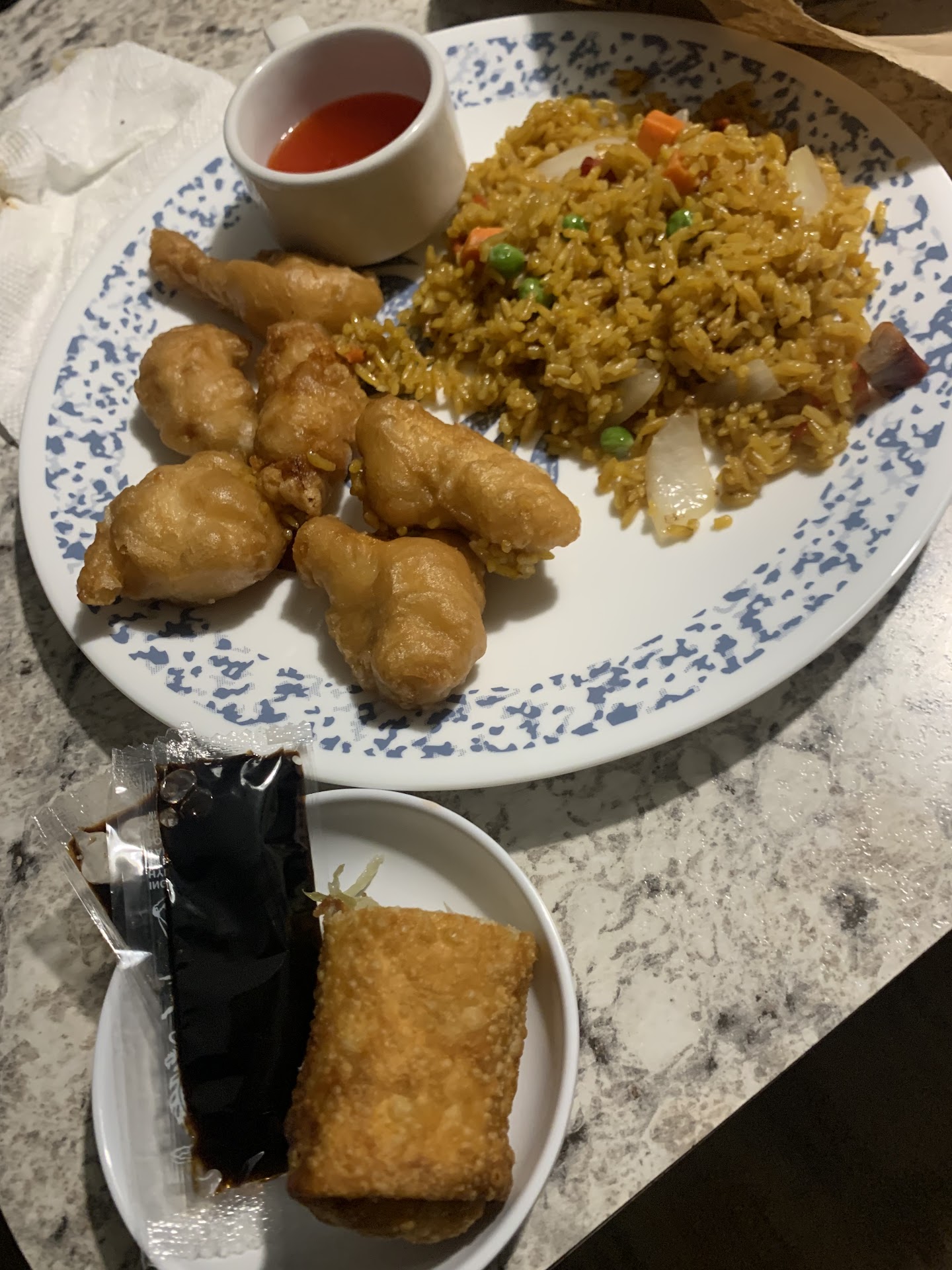 I ordered delivery. Be prepared to have some patience with whoever it is that takes orders. My call was answered by a woman. I ordered, she repeated, but I honestly have no idea what she said the entire conversation other than the total and expected wait time of 30-45 minutes. I ordered at 7:30 pm on a Saturday night and it was here by 8 pm--excellent time for a Saturday. The food was alright. I ordered crab rangoons, vegetable fried rice, and sesame chicken. The sauce for the rangoons tasted like mildly salty olive oil (which maybe had food dye since it was neon red)... definitely not the tangy sweet and sour sauce I am used to. The rangoons were also luke warm. The fried rice was EXCELLENT! In their veggie version, they have a good mix of veggies and even add water chestnuts (one of my favorites). The sesame chicken was alright... a little chewy and overloaded with something that left a weird after taste. It wasn't so bad that I wouldn't order there again... but since I'm new to the area and didn't know any better, I will definitely try out the other chinese food places before calling them up again. I will say that they guy who delivered the food is very nice and very cheerful :-) I gave them a top score for decor because of the guy who delivered the food being so nice. I never saw the...