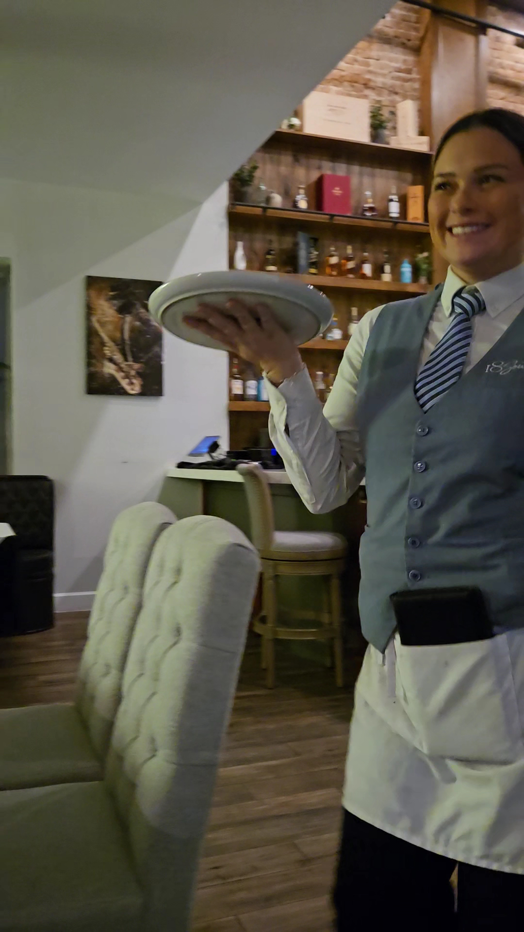 The door opens on the other side, and the women find seats at the bar while the hostess goes over to talk to someone.