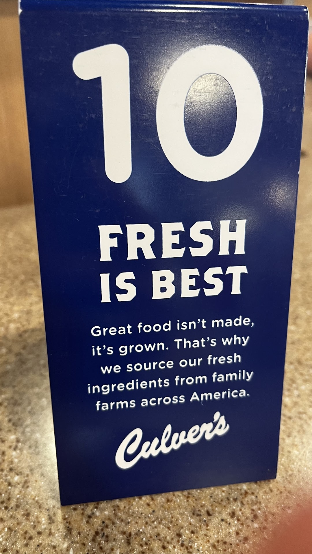 Read moreThis was my first experience with Culver's. Truth be told, I have never heard of them until I ran across this Culver's. We stopped in at the end of September, 2023. We entered the restaurant only to be greeted by a ghost on the wall :) Culver's was fairly busy, but the line to order went fairly quick. We picked up a menu to study before hand, so we didn't hold up other folks. We went with burger meals. She picked the Deluxe, I went with a Butter Burger. The two single burger meals (fries and a soft drink) Culver's gives you a number placard, then fill your drink, before you find a table and wait for your food to be delivered to your table. The wait wasn't all that long considering the food is prepared fresh for you, like some other burger chains, but not most. The food arrived to our table without issue. We found the food to be quite decent. My burger was just a little dry, but good. The burger was a little thin, but fairly large in size (circumference). And still better than most burger chains burgers lately. So if my burger being a little dry, was just a fluke, that's even better. The wife said her burger a quite good. We ate our meal, then made the mistake of getting custard. But since I decided to do this review, I had to do it. The custard was quite good, and somewhat reasonably priced. But even though we purchased single burgers and small custards, we were a little too full. So there's the dilemma. Burger meal or custard? I cannot have both. 😀 The restaurant and restrooms, were fairly clean and decently kept. This is the stark difference between the Culver's and another similar burger chain we like, just up the road. So Culver's was a pleasant experience with decent food and custard. We paid about $18 for single burger meals. About another $10 for small custards. I did get a Turtle sundae that was very good. So Culver's is not inexpensive. But it seems to be overly priced on par with the other burger chains. The difference is the food is a lot better than most other burger chains. There are a few that are this good. But not most of them. All in all this Culver's was decently clean. Not overly expensive, and the food actually tastes good. I'm sure we'll be back to visit...