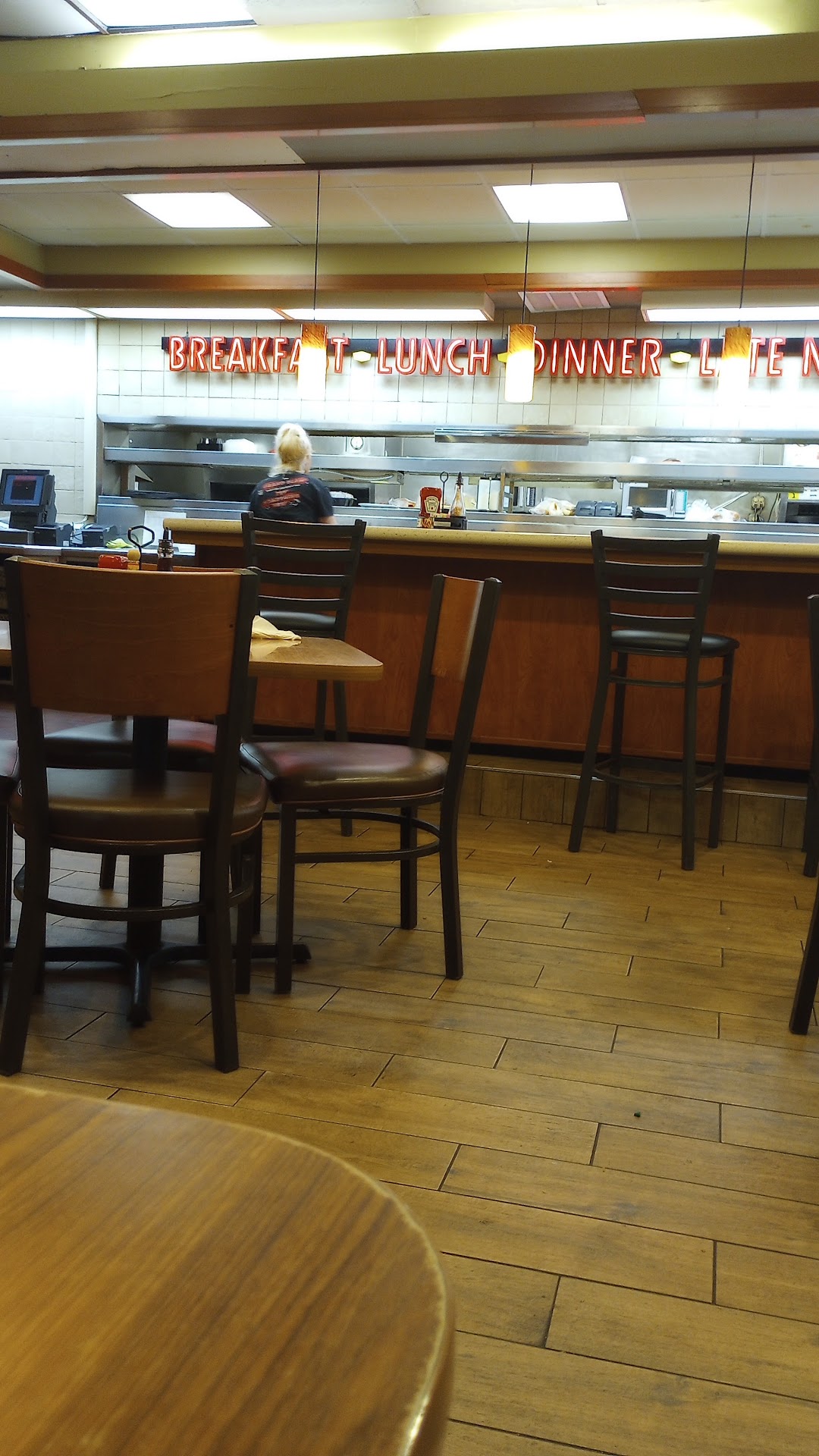 Read moreStopped in for something hot while traveling..arrived around 10pm .. maybe the day crew would be better but the night staff was .. "Horrible " if I thought you could ruin bacon,hashbrowns and pancakes I would never had stopped.. I had hoped ordering something so easy to cook would make this a good experience... Wrong.. upon entering I went to use the restroom.. it was nasty.. dirty clogged toilets, no toilet paper and looked like it had never been cleaned before.. that should had been enough to make me realize this would be bad place to dine. But I was exhausted so stayed hoping the best.. 1st off... how do you ruin pancakes?? I've never eaten such dry tasteless pancakes.. the bacon was inedible.. burnt and so hard it couldn't be chewed.. the hash browns were half cooked ..they looked good until you ate them and they were cold and obviously not cooked thru.. the scrambled eggs were the only thing I could eat. They didn't taste good but were edible. the coffee also wasn't bad.. at least our waitress was friendly and I don't blame her for the disgusting food..she at least was prompt with our coffee and taking our order...also the food took way longer than it should had. We waited almost 45 minutes. while we waited for the food the " cook " came out of the kitchen and was more interested in talking to friend's? or whoever they were ..if he had given as much attention to cooking as he did his friends??? this review could be different.. this place is outdated, dirty, torn seats at the booths and just not a comfortable or welcoming place... I would avoid it if possible and try a different...