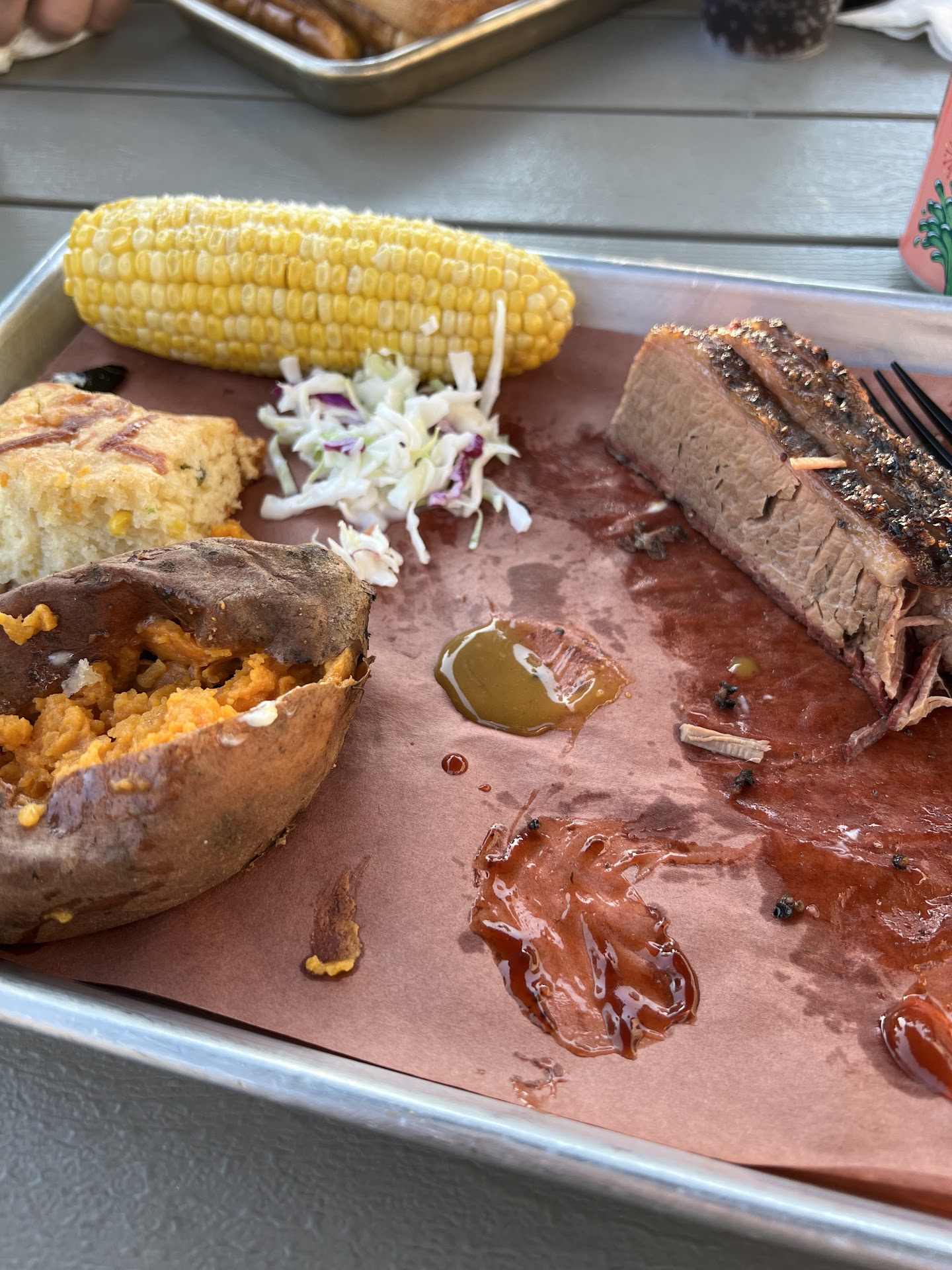 Read moreWe stopped here after a few hours at Silver Springs and so glad we did. First you’re greeted with the smell of smoked meat right in the parking lot. The restaurant is very clean and tidy. The ordering system very clearly explained by signs and the server. Basically like most bbq places you order and pay at the counter and they bring your food out to you. It was easy and efficient. The server was extremely helpful and kind and even got a drink for our young son who was getting inpatient with us trying to decide what we wanted. We had a somewhat large party of 7and we choose to sit outside since it was beautiful out. We came early evening so it wasn’t an issue for us to take up two tables. The seating outside was just clean and well kept. The food was delicious. Tbh I’m picky about bbq because of my husband and I usually find myself feeling he could have done better. But it was not the case here. I got the brisket dinner. The meat was so tender and not fatty at all. The sauces they have went perfectly. I mixed the Caroline with the spicy and it was chef’s kiss 🤤🤤. I got the sweet potatoe and corn with it and both were excellent. I loved the variety in sides and that you can pick if you want something heavier or lighter and that wasn’t all fried choices. The cornbread was also very good. I also tried the coleslaw which I am also picky about. It was fresh, great crunchy texture, and the perfect amount of sauce to it. Overall I finished my entire plate which I can’t remember the last time that happened. My husband got the spares ribs with Mac n cheese and toast and the fried Mac n cheese balls. He said everything was delicious and he too finished everything. The rest of our party all really liked their food as well. The chili I was told was very good as well as the burnt ends and the fat boy sandwich.