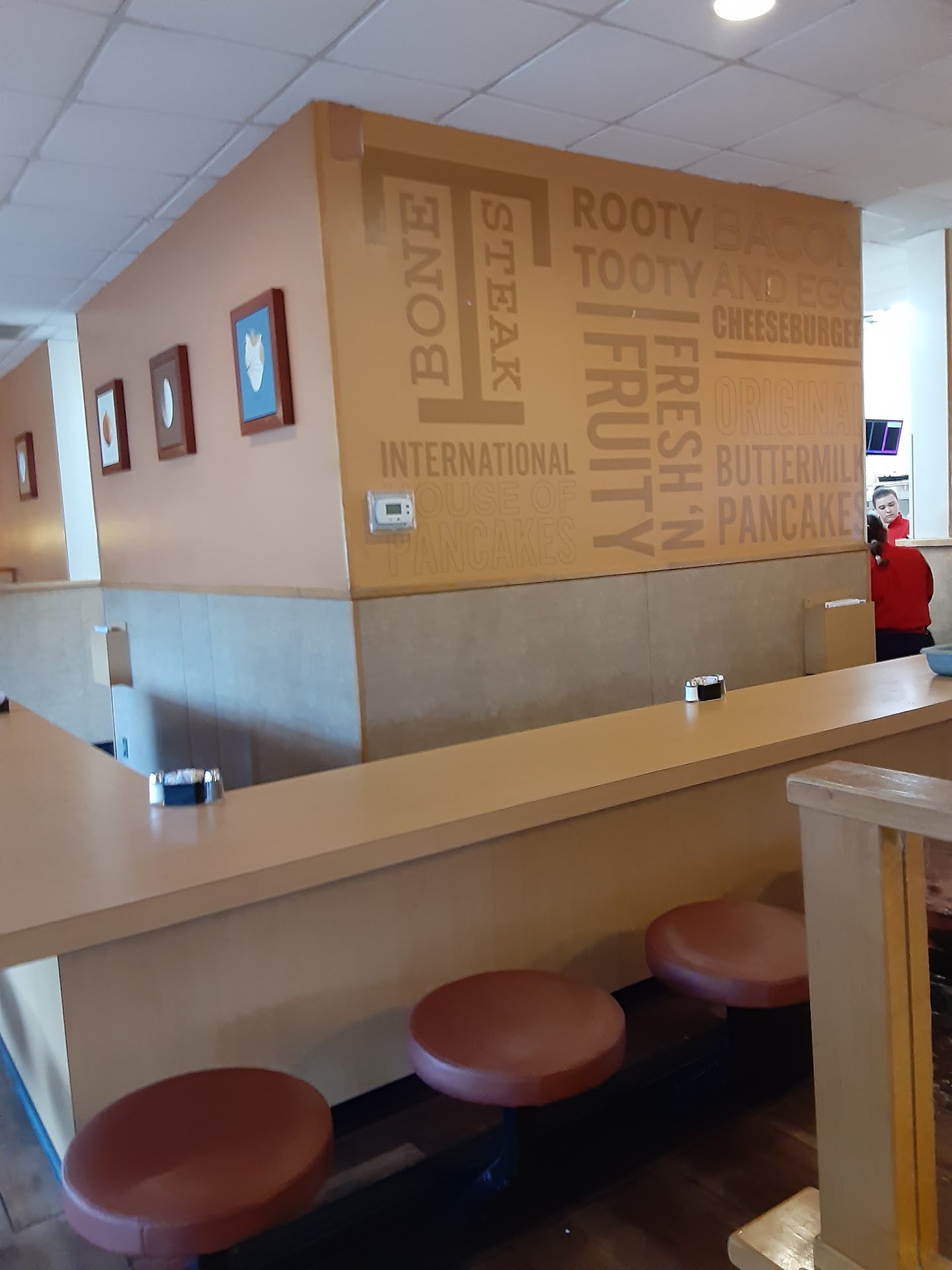 Read moreI'm used to IHOP being busy and clean. This particular location had one other couple who was already served their meal when we arrived. It was after late lunch time, before early dinner, so during a very slow time. First, a lady at the post by the door asks "2?", without looking up at us. She was working on something, which we understood. She said it'll be just a moment. After about 2 minutes, she finished what she was doing then sat us and said our server would be with us in a moment. After waiting a few minutes, she arrives and gets our drinks and our order. She was nice and helpful. Though I did mention the table was sticky and nothing was ever done about that. It took quite a while for the food to come out as she said the kitchen cooked the wrong meal for me, so there was that delay. A tea refill would've been lovely while waiting. Once we were done, I visited the restroom. That was my biggest regret of the entire visit. I have never in my life seen an IHOP with a ladies room in such a horrible state. Floor covered in trash and debris. I'm just going to leave it at that as the rest I don't want to think about. But I've seen gas station restrooms in MUCH better condition than this. Plus, you could barely open the door since the diaper station wouldn't close properly and stayed laying open blocking the door from fully opening. I don't think we'll be going back to this one. Everything else I can understand. But that? There's no excuse. It's not like it was busy or they were in the weeds & couldn't get to it...