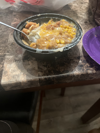 The chicken itself tasted like old plastic. The gravy had a little bit of mashed potatoes. The Mac and cheese was bland which Iâm sure that comes out of a bag. The only good part of the night was my chicken pot pie.