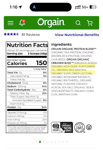 5 Star for service 2 star for quality of products. The plant based protein is the cheapest in the market, Orgain not to mention its ingredients cause inflammation and gut issues!!. See my pics? You are selling “superfoods” that reduce inflammation and/or considered healthy (chia seeds, ginger, cocoa nibs etc ) but the base of the smoothie is using chemical laden product. You are 4 doors down from GNC or better yet online has some amazing unflavored pea protein (just one ingredient!). You need to offer unflavored protein and unsweetened plant based milks —- since the fruits all have natural sugar, plus if you add the honey, makes it sweet enough. Please consider serving customers planted based better quality options. $15 for a smoothie , you can do better on products. ...