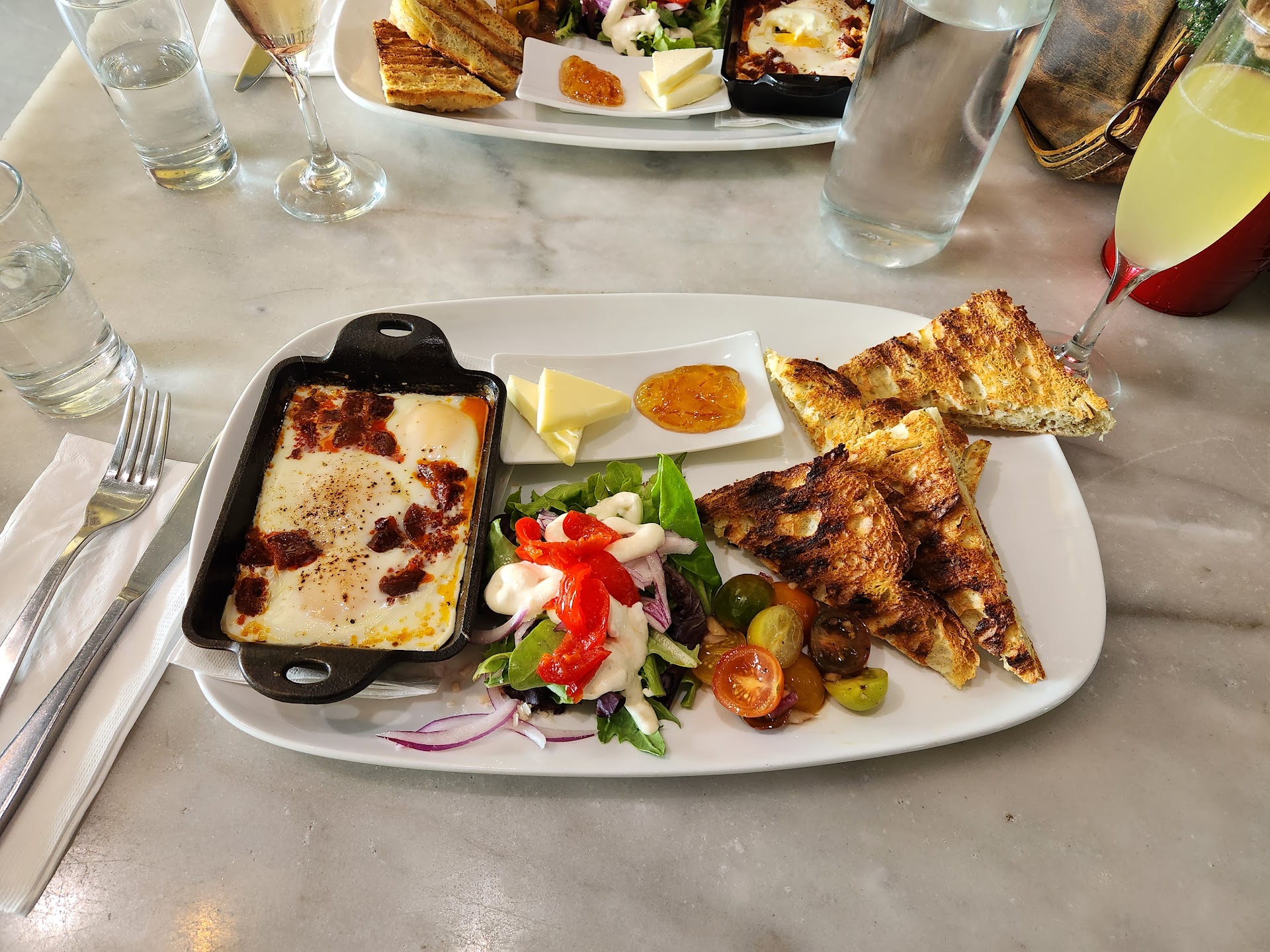 Had the Spanish egg breakfast. Eggs cooked perfectly in cast iron skillet with pieces of chorizo. Has a side salad(awesome house dressing), some heirloom tomatoes dressed and the crispy bread. I used the butter and preservatives on some of the bread, and the egg on the rest. Taste, and texture with great presentation all flawless. Had a few mimosas, love the original of course, strawberry is good and the blackberry is my jam. The bubbly to fruit ratio is just how I like it. The essence of fruit!