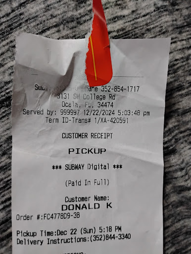 Read moreI ordered three subs from this 3131 SW collage road location in Ocala Florida at about 5:30pm and the Dash driver brought them to the parking lot in Gladewinds apartments off 20th but, he didn't speak any English so we couldn't communicate via text or call so he brought the food back to the store and hours later I ordered the same three subs and this subways sent me the exact subs from hours earlier that the driver returned to the store, which were soggy mush and charged me for both orders. $50 for three soggy subs that should have never been sent out after being driven around return to the store and then hours later returned to me/ the customer around 7:30pm in horrible condition due to the toasted bread being hard as a rock in some places and soggy in others. I've called the store at least 6 times and nobody answers so I had to contact my bank about the charges. Worst...