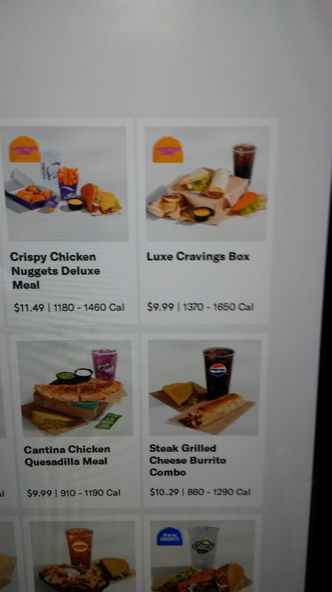 Read moreThere were no napkins, the touchscreen order machine had dead spots, there was no soap or paper towels in the bathroom. I had a tostada a month ago, right after they can out. They were clearly less than before they disappeared, with only a small circle of beans and sauce in the center of the tortilla. Yet yesterday, the tostada was less than the one a month ago. This was mostly lettuce and cheese to cover a thin smear of beans. No doubt the lettuce was to hide the lack of beans and sauce. In a month, the reduced size was reduced again. The gordita was good and filled properly. I was going to order the $7 Luxe Cravings box that Taco Bell advertises which this store sells for $7.99 but yesterday, it was now $9.99. That is pretty ridiculous that you can't sell for the advertised price a month ago and now it is even higher ($10). No one responded when I said they were out of soap and hand towels or when I said they were out of napkins. Another customer took both napkin dispenser lids to the counter and they still didn't respond. It wasn't too dirty. The floors were fairly clean but it was clear no one had wiped the tables. And the receipts no longer tell about feedback on...