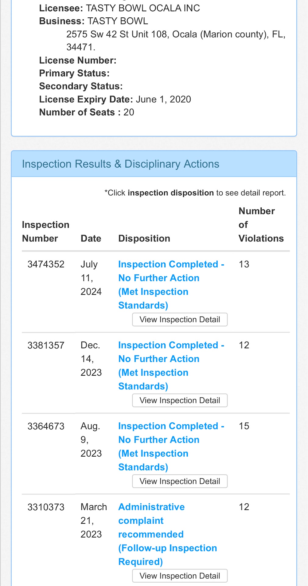 Look up tasty bowl Ocala health inspection on google, they fail over and over again. How are they still allowed to be open? Each time they are inspected that have 13, 15 health code violations, many of them “high priority”. Roaches on the counters and in the cookware, not hand washing, expired raw meat they intend to serve, “mold like substances or slime” on food preparation surfaces, on and on… unfortunately, I didn’t know this before I went to eat here. I got the orange chicken and egg rolls. This was the worst food poisoning I have had in my entire life, and I have a strong gut. I know for a fact it was due to the food I ordered here because it was the only thing I ate that day… and the last thing I was able to eat for days… This place needs to be shut down, it’s an actual risk to the community. Once again, why are they still up and...