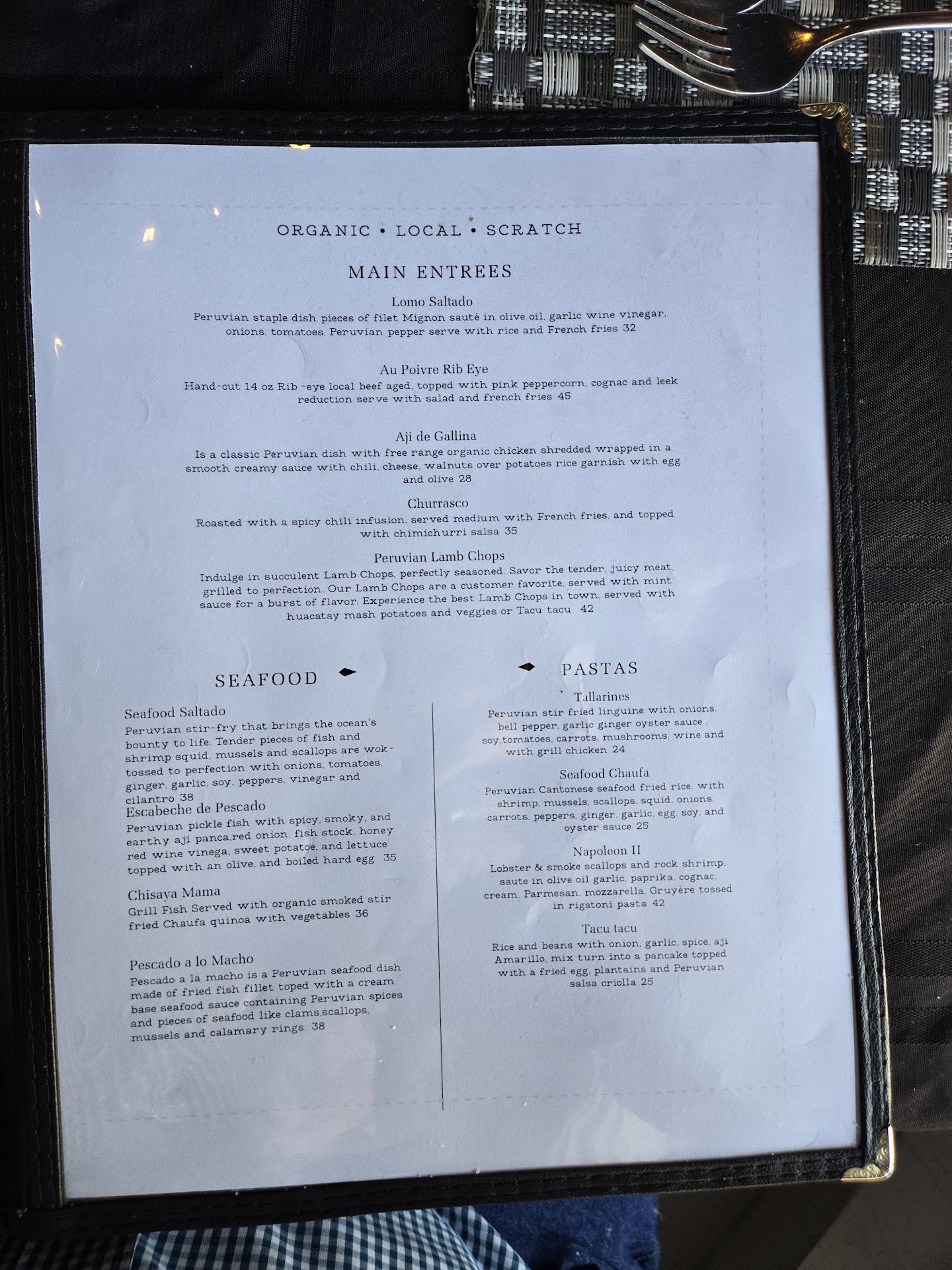 I’ve dined at this location at least 2-3 dozen times. I remember showing up hoping to eat at what was Sabores Latinos and disappointed that place was gone, but I was quickly won over. This place is great and it has gotten significantly better over time. At first, there were missed or incorrect orders but I haven’t had that happen in a long time. Orders used to take a much longer time. They still take longer than other places but it is reasonable for what you get. It’s not fast food. It’s a fantastic dining experience where everything is made to order. The chef is a real pro. Everything is top notch as far as quality and freshness. Plating is beautiful. It’s has been fun to watch this place evolve and grow. The addition of pizza was an amazing surprise. I did not think a Peruvian restaurant would/could serve great pizza but was proven wrong. The pizzas are top tier. I had never tried fried pizza before but it was awesome. The Americana is still the king(new York style pepperoni pizza with a perfect crust). One always has to judge a Peruvian restaurant by its papa a la huancaina. This place did not disappoint with that beautiful sauce. The fried rice(chaufa) is always cooked and seasoned beautifully. The lomo saltado is the best I’ve tried including NYC and Orlando locations. I enjoyed the ceviche the one time I had it. The calamari and jalea mixta are to die for (definitely the only way I’ve gotten my kids to eat fish). Too bad the pescado chicharrón is gone. The tallarín verde is great. I really wish they did the green rice and chicken (maybe one day). I hope the pescado alo macho makes a comeback. Ají de gallina and escabeche are probably my favorites off the current menu. The soups are hearty and well seasoned. The alfajores weren’t my favorite but that’s likely because they’re different than what I’m used to(these are more chewy whereas I’m use to the flaky kind). The chocolate cake was dense and chocolaty without being too sweet. The tres leches was less like the typical yellow cake and more of a pound cake or scone but stellar. The fried ice cream was AWESOME. I’m use to the Japanese style. This was more like an ice cream beignet and so much better. I had the tiramisu today and enjoyed it. The wine selection is impressive for the small location. It’s a weird reference but I feel like this is the Led Zeppelin of restaurants. The songs remain the same but don’t always sound exactly the same. I’m a fan of those surprises and it shows the passion of the chef. Not everything on the menu is always available, but I suspect it’s to maintain the highest standard of freshness that I’ve come to expect. Nicole is an amazing server and very attentive. The music and ambience is soothing and welcoming. This place deserves a lot more...