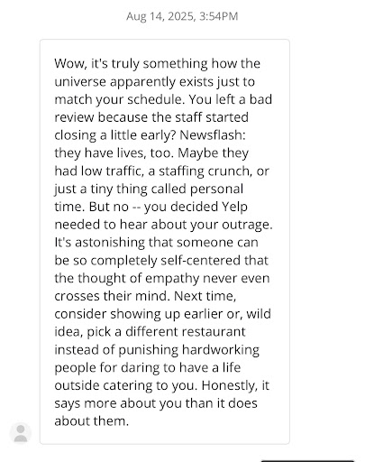 EDIT: wow. I’m completely disgusted with this place now. My mom left her review on yelp and someone (presumably an employee) left this message to her. I can understand being hurt by a bad review, but this is completely unprofessional behavior. Original review: TLDR: Didn’t try the food and was turned off by the rude customer service. Wouldn’t recommend coming last 4, even though they are listed to close at 5.