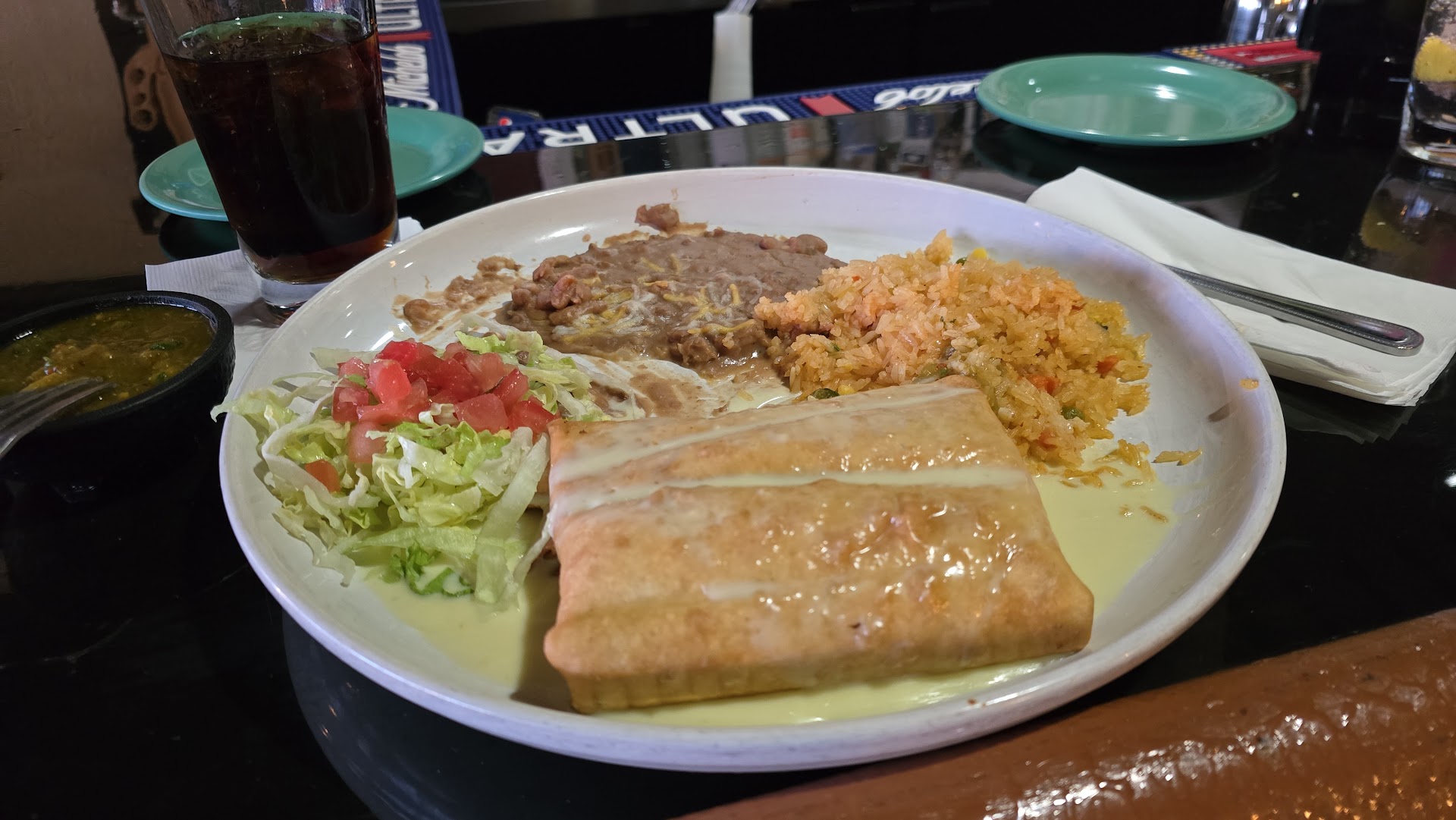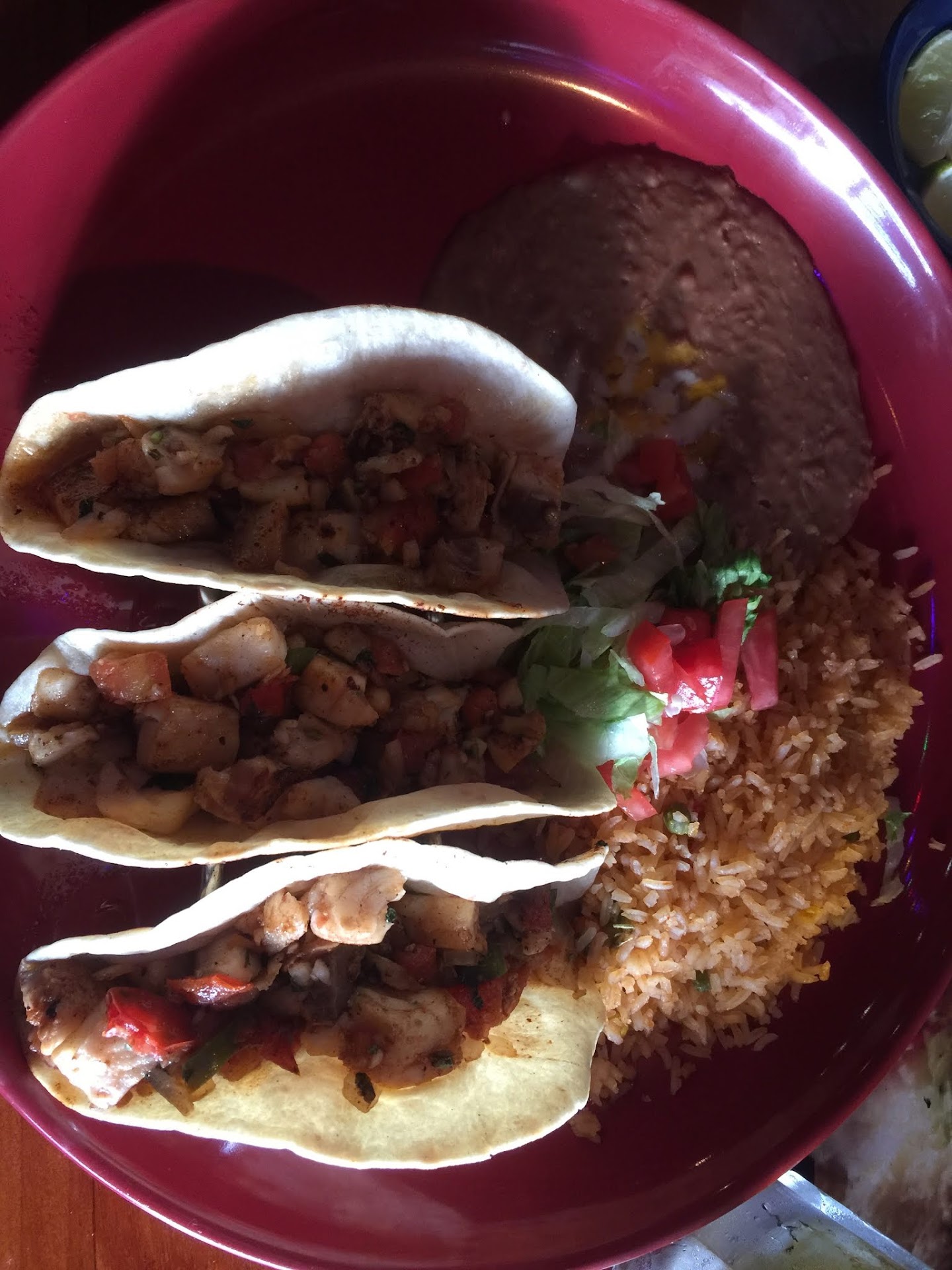 Read moreI'm really getting discouraged at the way restaurants are rated. Everything is a 4.5 stars... to me 4.5 stars should rock your world. It should be the kind of meal that you would struggle to make at home. For 4 stars the ingredients should be NOTICEABLY fresh and the experience should be special. This has little to do with the price - I think "mid priced" restaurants ($$, $$$) are often way worse than lesser ones ($). Unless we really came on a off day (it was a slow Monday) this place is farrrrrrr farrrrrrr from a 4.5. First, the people... no complaints there - nice friendly folks. Unfortunately that's the only positive we could find about this place. The chips were stale and greasy. The salsa was not fresh - I've had better from a jar. The fish tacos were tilapia, fishy tasting and DEFINITELY not fresh. The topping on the tacos tasted like it came premix out of a bag. My wife could only stomach one of the 3 and gave up. My Chili Verde was so bad I could not even finish 1/4 of it. Even the Spanish rice was flat and the refried beans tasted like they came out of a can. Seriously... if you rate this a 5 star establishment you really need to...
