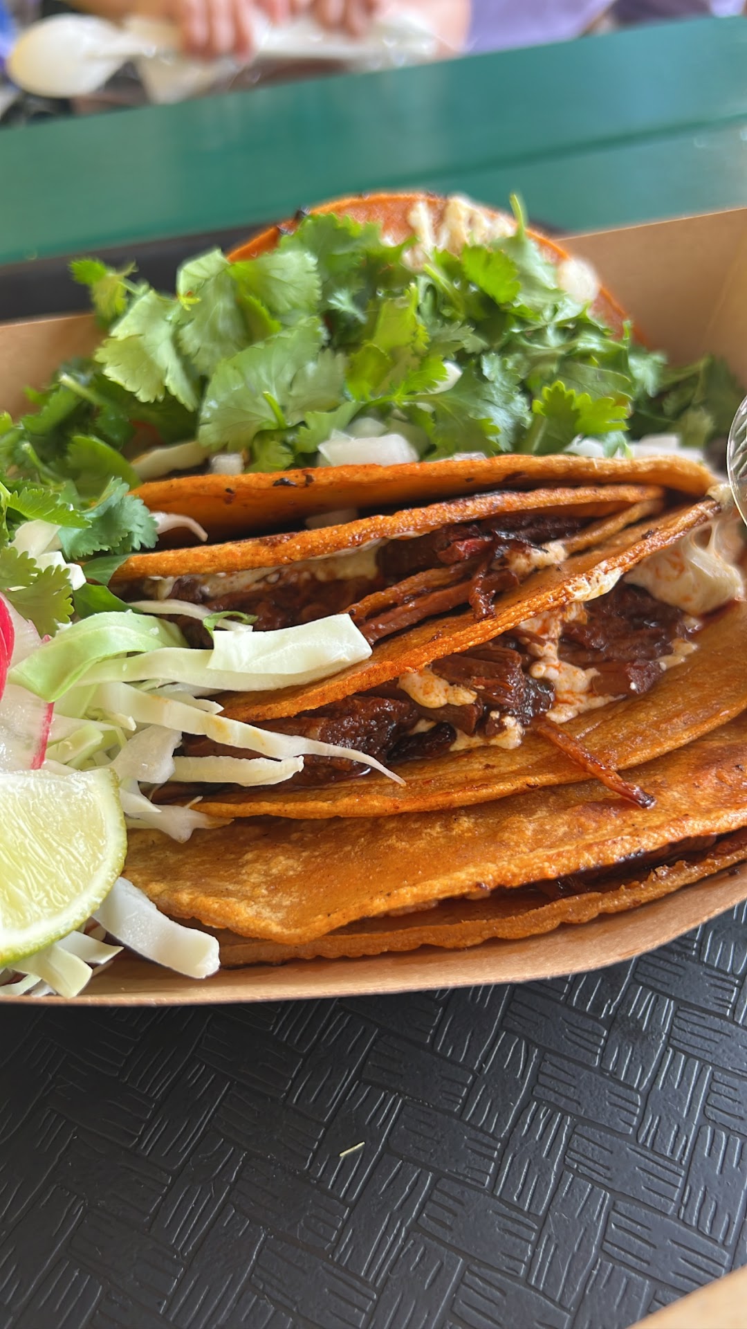 I was directed to this place when I went to Liquid Assets for lunch and saw the menu brochure posted (all under the same company umbrella as well as Annabelle's BBQ). The food was deliciously AMAZING I was too hungry to take pics but I ordered the Pescado al Pastor, Al Pastor and Chorizo tacos for my lunch, they were so tasty I ordered 6 more tacos to take back to my hotel for dinner to share with my family. I ordered the Quesabirria, Al Pastor for my 6 year old and more chorizo tacos, and for dessert the Tres Leches and churros. Let's just say not much talking at dinner they enjoyed every bite. My daughter and husband loved the Quesabirria with the consommé. All the proteins were deliciously seasoned and the beautiful fresh accompaniments, pickled onions, cabbage, lime wedges, cilantro and salsas tied it all together wonderfully. The Tres leches was delicious not too sweet but I didn't care for the fruit on top. The churros were fresh,crisp and yummy, but the dulce sauce texture was little curdled and lumpy, I think this version may have been done in the oven which requires constant stirring resulting in said texture. The citrus beverage agua Fresca I ordered with lunch (so good) and the pineapple one to take back with me.
