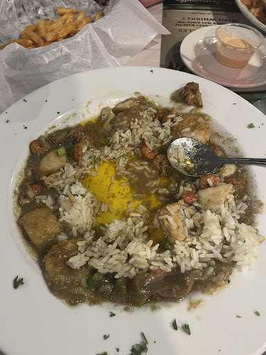 Read moreMore like 3.5 stars (mostly due to the inconsistency of the food quality) First time at this place since we bought a condo a couple of years ago nearby. I was not impressed with the food. Service was great, we had a young woman with an accent that sounded Russian (maybe?). She was great! Live band was playing over on the bar side...also great! I see they have live music almost every night, so we will be back for that. Not for the food though, though admittedly once is not really enough to go on, but I will try something different next time. We got the Cajun sampler to start. It came out with our meal, which was not ideal. It was steak, chicken and shrimp cooked in a blackening seasoning. Steak was melt-in-your-mouth, chicken was very good, and the shrimp...I wish there were more than 2. My entree, however, was bleh. The Jambalaya claimed 3 peppers on the menu, and the server even asked if I like spicy food because it is spicy. I presumed it was Cajun, since Jambalaya is typically Cajun, it wasn't; it was Creole (tomato-based instead of a Cajun roux). It was not spicy in the least, my 1 year old grandson could have eaten it without a problem, and I am not exaggerating. The chicken was chewy, which was a very odd texture for chicken. The sausage was not andouille sausage as you would expect, but tasted more like hotdog. Again, the shrimp was amazing. It was loaded it yellow and green onion, and too much bell pepper, yet it lacked flavor. Overall it was bland and tasteless aside from the tomato base and hotdog. Wife got the steamed shrimp and a baked potato. Again...shrimp amazing. Baked potato was standard fare and no complaints about it. We were surprised when the server brought a bread pudding to us for dessert. She said it was because the appetizer came out late. We were pondering a dessert when she brought it out. It was very good. Overall, I would come back to give it another try, at least they have music if the meal is not the greatest again, and I can walk there. Hopefully the next NOLA-style food I order tastes a little...