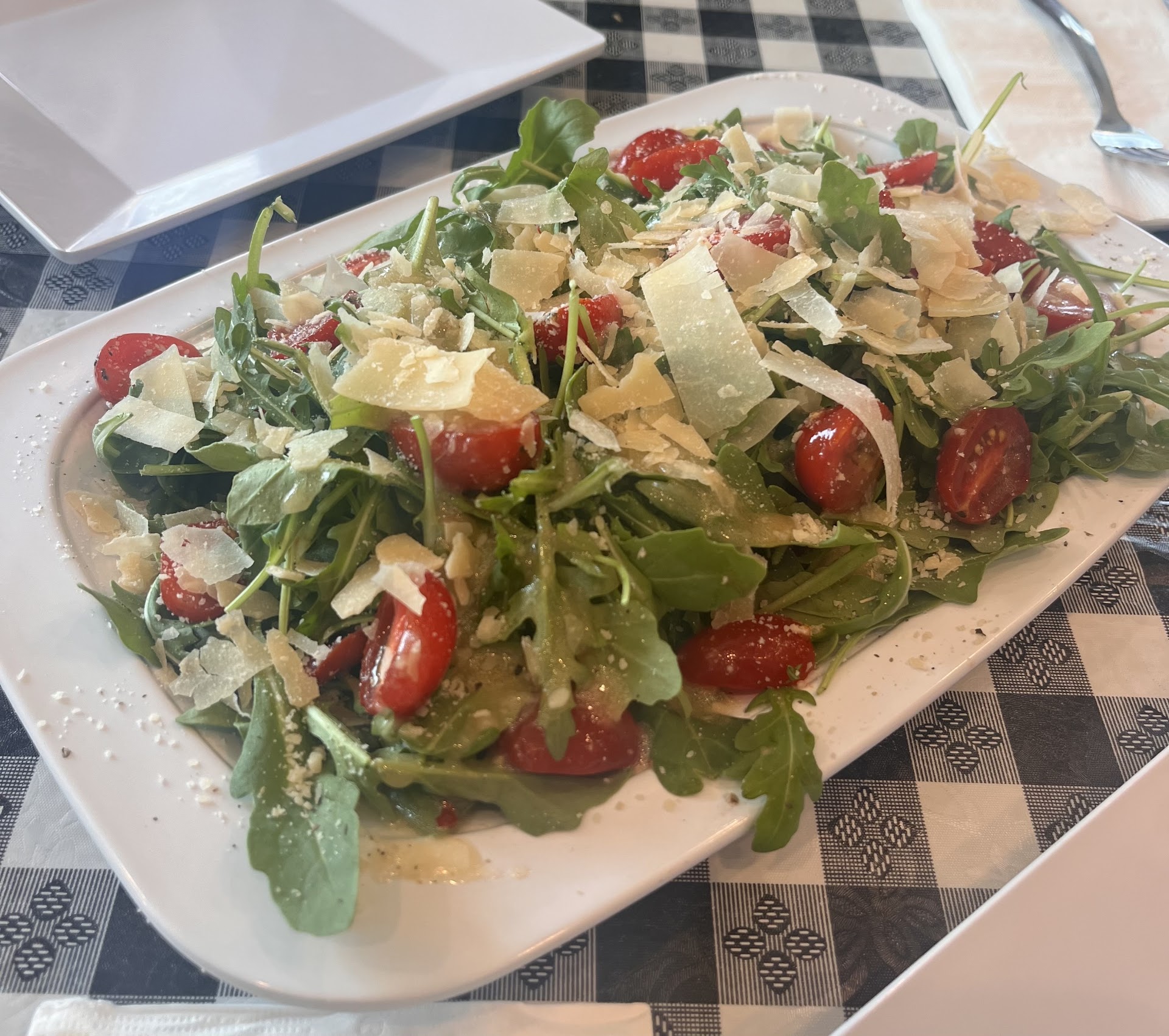 One in our group just ordered the calamari app and a salad. More than a meal together. Calamari arrived sautéed with a tomato sauce with garden peas. Wonderful.