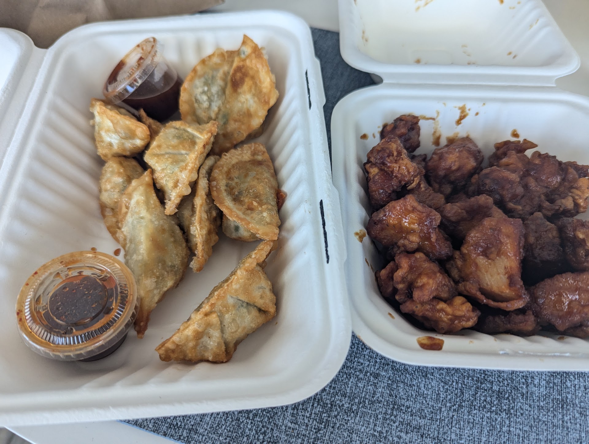 Ordered the spicy soy chicken bites and 10 dumplings.
