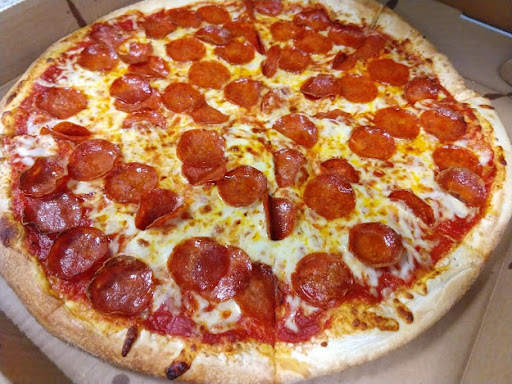 So I called around 5:30 on this Sunday night. We saw that the pizzas come in only two sizes, and having read how "small" they were, we opted for the larger of the two...the "extra large" pepperoni. (16 inches) Gal was friendly on the phone. Took a credit card, asked for our room number and told us it would be 30 to 45 minutes. Cool, take your time. Around 35 minutes later, there was a knock on our fourth floor room and a friendly appropriately-masked guy delivered our piping hot pizza. Crust is nice and thin and foldable, with lots of gooey stringy cheese, covered in pepperoni (we blotted some of the grease). Sauce ample and tasty. Nice pizza. Very rich! I could only do two pieces myself. We would have been perfectly fine with the smaller one for the two of us.