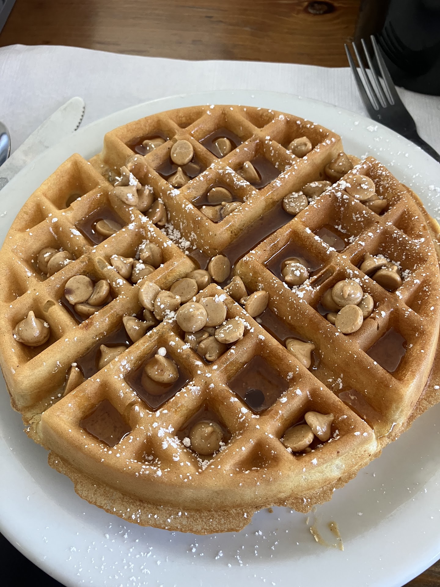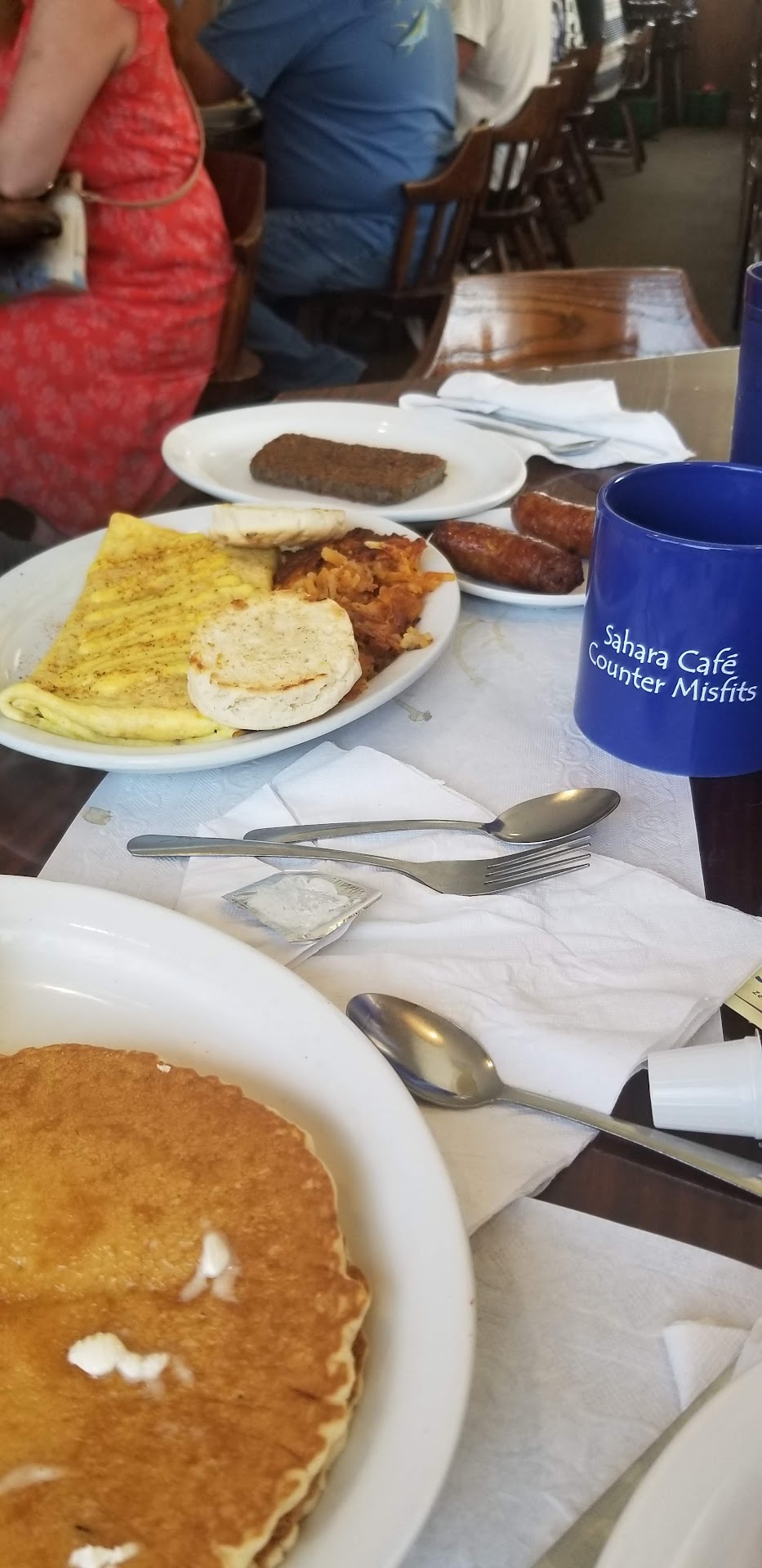We went to the Sahara Cafe this morning for breakfast as it has a high rating on Google reviews. They did not disappoint. I love the decor (Grateful Dead) and the staff were all super friendly. Coffee was hot and tasty in a super sized cafe mug, and I had a hard time choosing a menu item as there are many great choices. I settled on the Big Eddie C omelet which was packed with bacon, ham, sausage and scrapple and topped with American cheese. I got a kick out of the fact they put a little medley of what is in each omelet on the top so the servers know what is inside, nicely done. I also thoroughly enjoyed the shredded well-cooked hash browns. I guess that's their signature potato side and they're good at it. My wife went with the pecan pancakes and a side of bacon, both of which were delicious and very well made. The pancakes were fluffy and delicate and full of pecans. I can only imagine this place gets a very busy during the height of the summer season, we were lucky enough to try it in October when the places are less busy. My only regret being is I caught a glimpse of somebody who got the daily special which was sausage gravy over biscuits and I must say never seen that much sausage in a gravy it looked wonderful and I look forward to trying that on my next visit. I definitely recommend this little cafe and we look forward to coming back next...