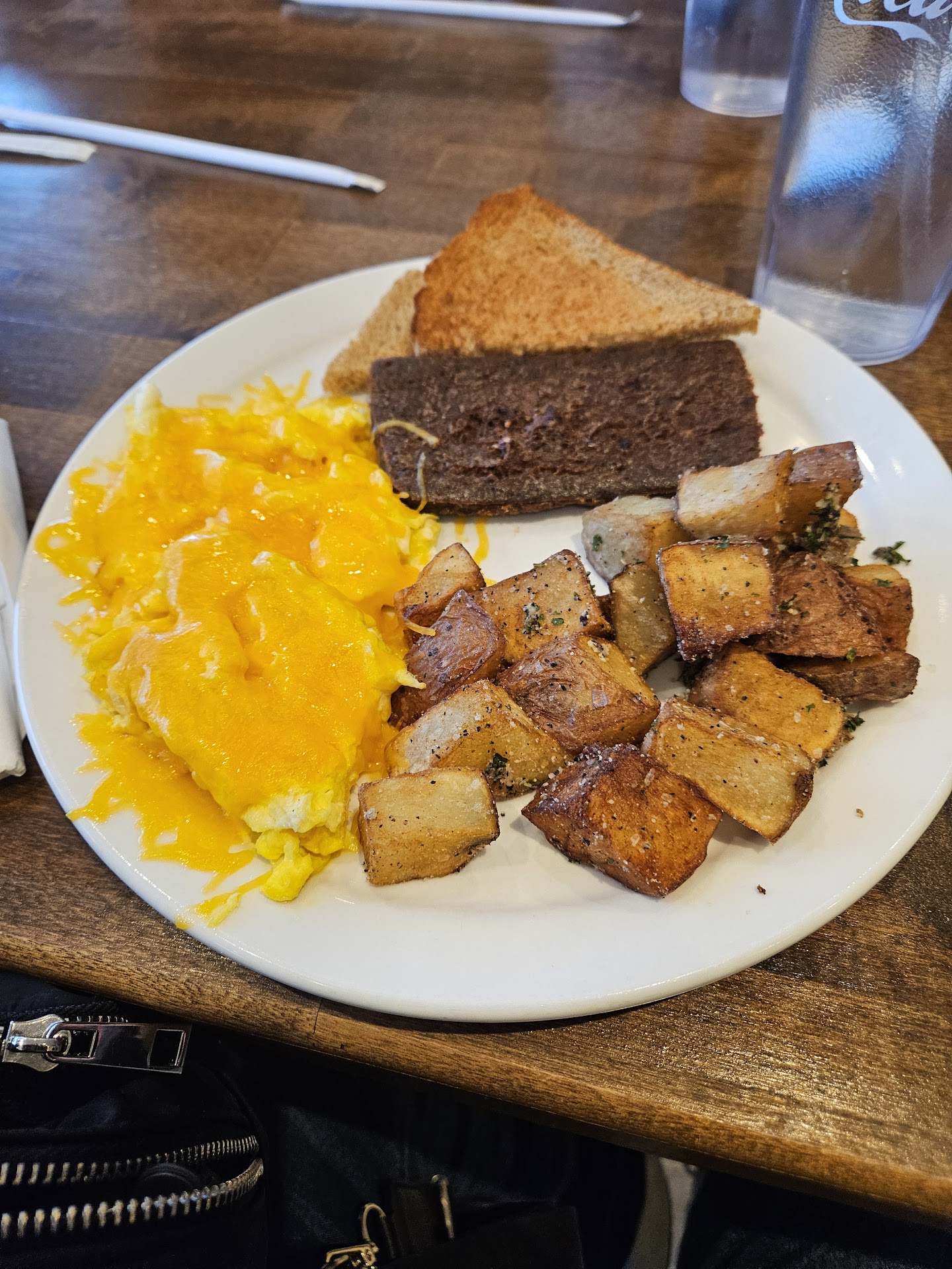 My boyfriend was served French toast and scrambled eggs. He said neither was satisfying to him. He also ordered an apple juice for his drink. The apple juice came in a very small what looked like a 4oz mason jar and the jar was not cleaned. He sent it back.