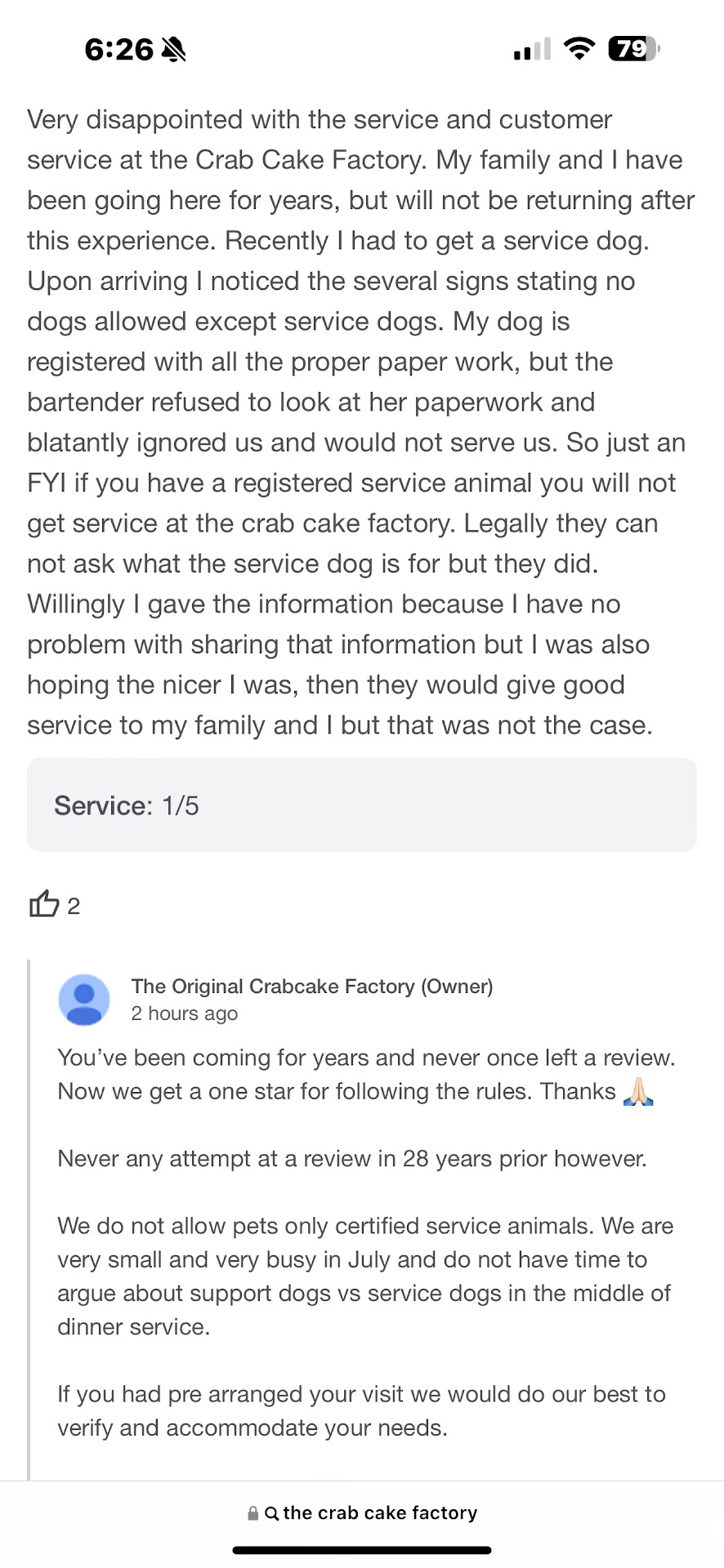 Upon arriving at the crab cake factory at 11am on Saturday and observing PLENTY of open seats, my family and I were respectfully ready to provide proof of registration of the service animal after being illegally asked to do so. Following that, we were ignored and not given any service. We were not there looking for an argument “during busy dinner hours”. Matter of fact we had no problem leaving and taking our support to another small business in ocean city. Our family makes it a point to GENEROUSLY take care of small businesses, especially in today’s economy. However you tuned away good business all because I have to bring a 7lb service dog, who stays in my lap the whole time and most people do not even know she is there, everywhere I go in case of a medical emergency. I could completely understand bringing in an animal who was not behaved well and very large into such a small establishment and being treated the way we were, but clearly that is not the case.