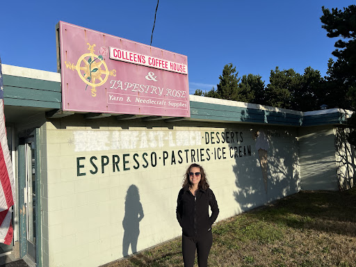 Colleen's business has been on quite a journey, existentially and literally, so Google maps may be rather confused as to the actual location of Colleen's Coffee House and Yarn Shop. As of 2022, it is closer to the beach, just over the little rise past the big wooden Ocean Park sign.