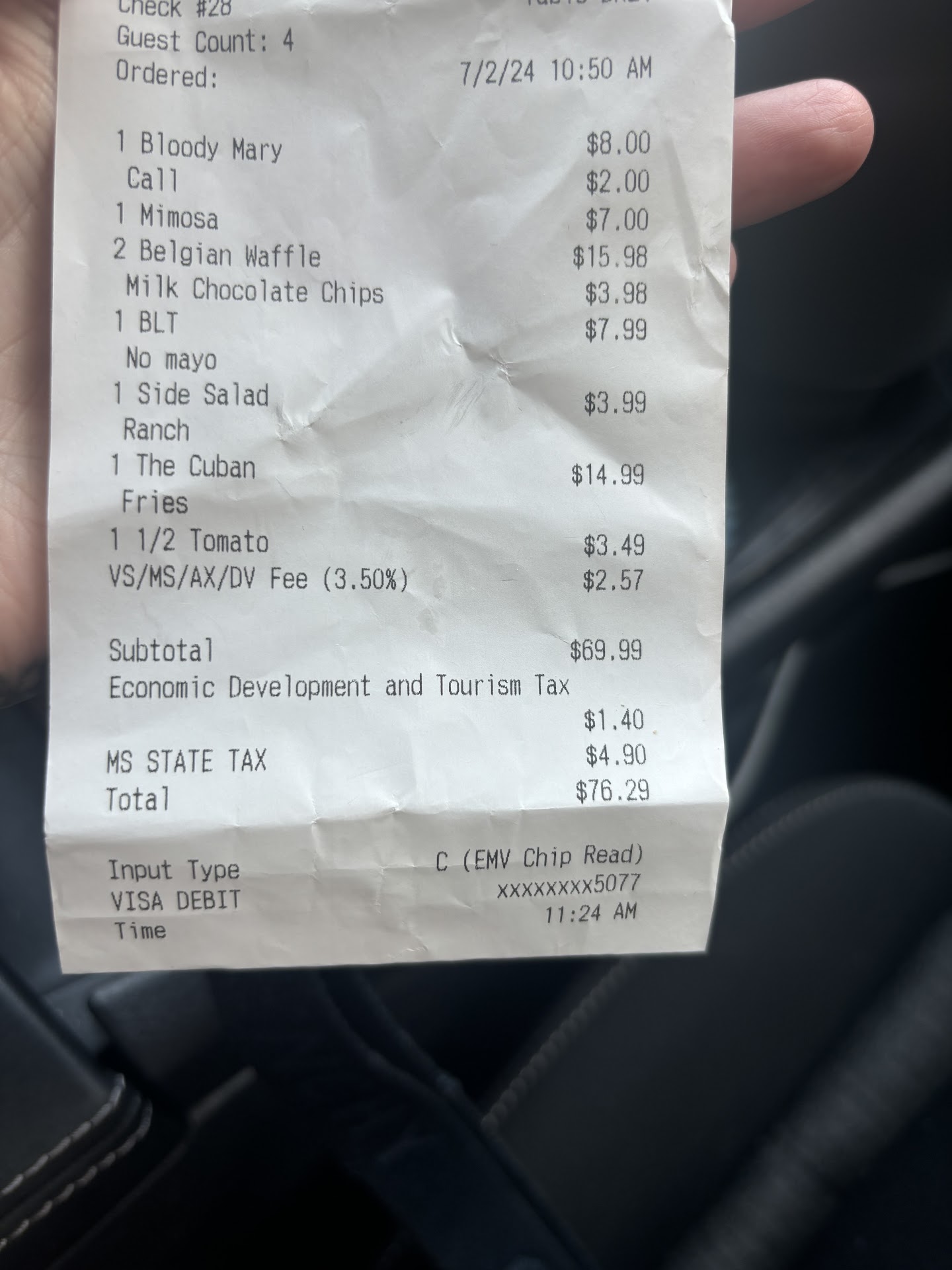 Read moreI walk in with my date and her family. We were told to sit anywhere. We get our drinks in, 2 sodas, 2 orange juices. The server comes back and asks for our order, 1 seafood omelet and 2 breakfast burgers all with a side of grits. He asked how we prefer our burgers and eggs cooked on them. One customer didn't realize you could order the burger differently (she's younger) her mother said it'll be well done for hers with an over medium egg and then I asked for mine to be medium burger with an over easy egg. Food came back and I sliced mine in half and it was a hockey puck. It's fine I'll eat the damn food because our server did not return until everyone was done eating. I did not want to be a Karen on a date, so I did not feel like it was necessary to address it. Maybe it's different y for their lunch service but breakfast was not an enjoyable experience. If I'm spending 16 dollars on a burger I would like my burger to come back how it was ordered. Took a lot of willpower to press the add 20% tip. $66 with 20% tip was short of 80 dollars. Save your money and get some "fast food" atleast you know you're getting what...