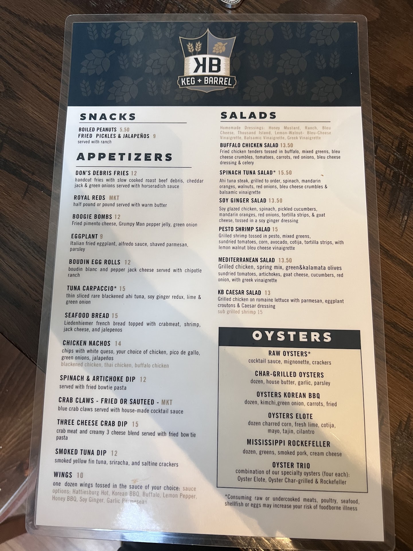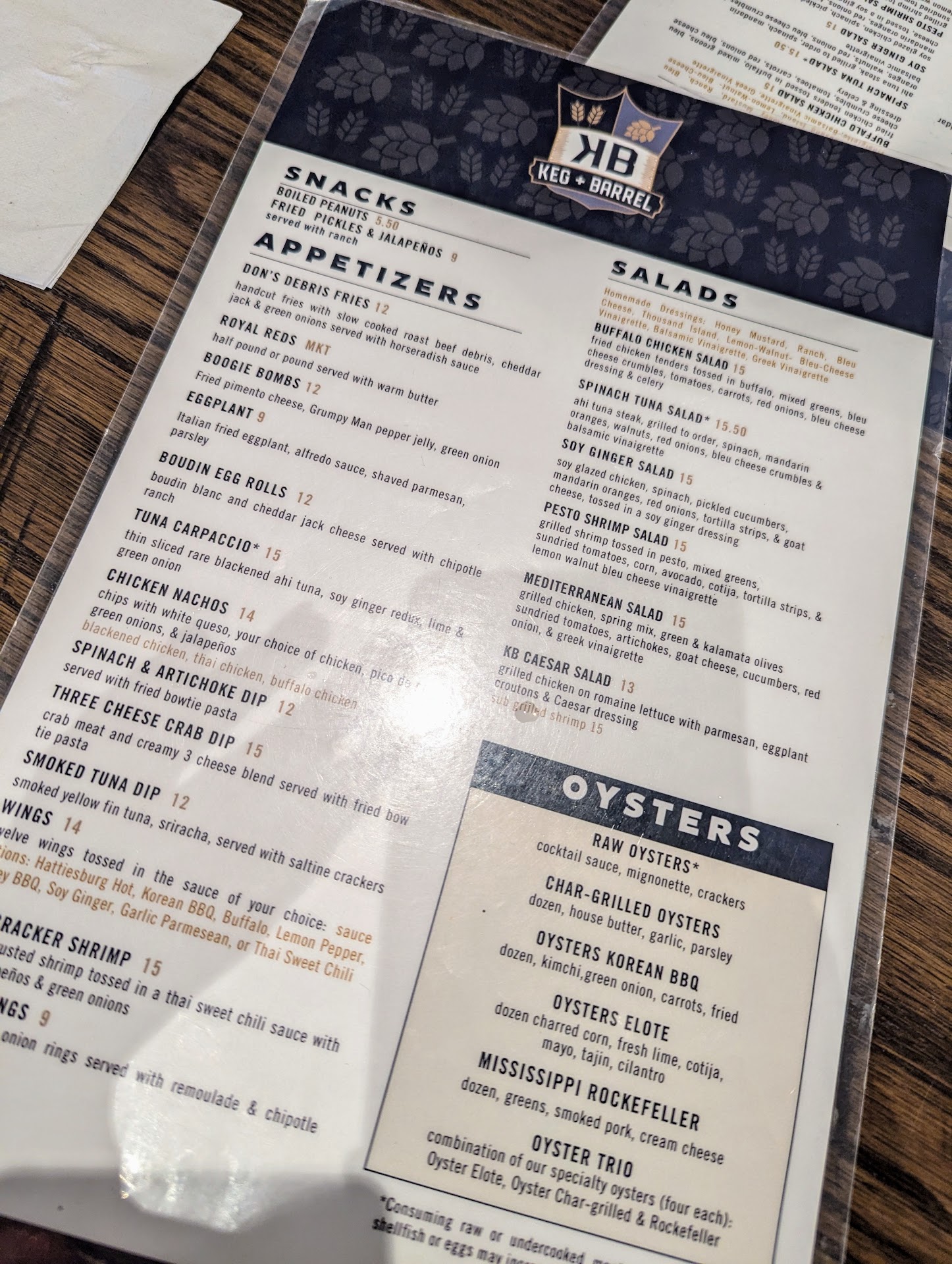 Read moreDate night this past weekend was at Keg and Barrel Ocean Springs. We've previously eaten at the one in Hattiesburg, and loved it. So, we decided to try this one, and we were incredibly impressed. From the service to the drinks to the food, 10/10 all around. Alandes (I hope I'm spelling that right) was our server, and he was top notch! We started with drinks. I had the Not A&W's Cream Soda, and my husband had the Sippin Juice. Both incredible. We shared a few starters. Wings (half lemon pepper, half Hattiesburg Hot), Firecracker Shrimp, and the Oyster Trio. We were accidentally brought the crab dip, so I snatched a pic of that, too. Lol. The wings were great. Great flavor, crispy, cooked perfectly. The firecracker shrimp was great as well, with fried jalapenos mixed in. Perfect amount of heat. The oysters though...y'all. Probably some of the best I've had in my life. The trio comes with Chargrilled, Mississippi Rockefeller, and Elote. Now, before you knock elote oysters, just try. They were phenomenal. The Mississippi Rockefeller has cream cheese, greens and pork. Like, 🤌🏼🤌🏼🤌🏼. We will definitely be back, if not just for the oysters. We live in Wiggins, and I would definitely make the drive just for...