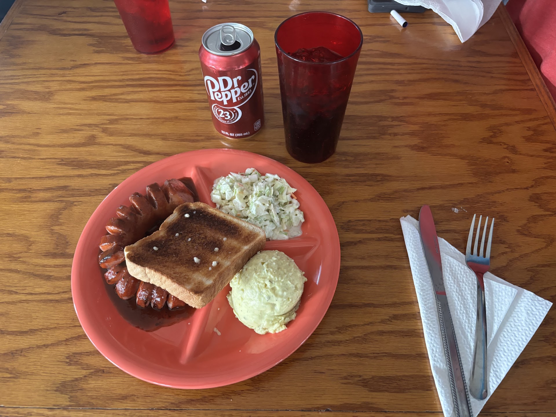 I ordered the sausage platter. The main course was very salty. Still edible, but I love salty foods and it was on the cusp of being too much for even me. The potato salad was also a bit salty with a dill pickle flavor. Honestly it wasn’t too bad. The best part of my meal was the coleslaw. Sweet, crisp and flavorful. The miniature pecan pie was good as well, though a little pricey.
