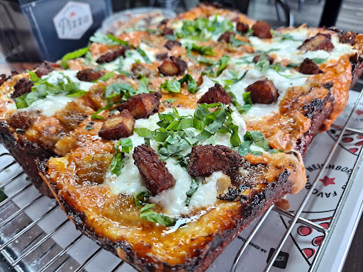 We had to get a Chicken Vodka Burrata Detroit Style after seeing so many photos and videos. My expectations after 8 months were high and this pie far exceeded my expectations. They let their dough ferment for a few days and wow does this make for a delicious airy yet thick deep dish base. The cheese crust was perfect and not oily. They obviously use the best quality mozzarella. Their vodka sauce tastes like vodka sauce not tomato cream sauce. The creamy burrata adds a silkyness that pairs perfectly with this amazing pizza. The chicken... Imagine if you could make chicken croutons that were crispy on the outside and tender on the inside. A perfect taste and texture addition to the best Detroit Pizza I've ever had. Seriously folks this pie screams cover me in cheesy goodness and come back tomorrow.