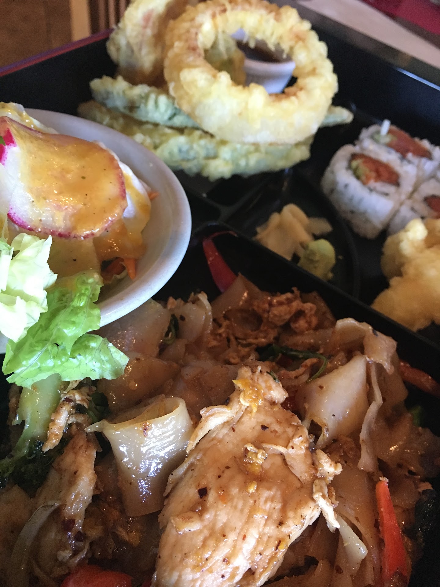 I came in starving and wanted to try both the Thai and Japanese food. The Thai & Sushi Combo Bento ($10.25) was perfect to order! I got the green chicken curry with a California roll. The bento includes soup (I believe it was Tom Yum), salad, and vegetable tempura (zucchini, onion, broccoli, and carrot). The food served was definitely more than enough for one person but was delicious! I think I finished it all.