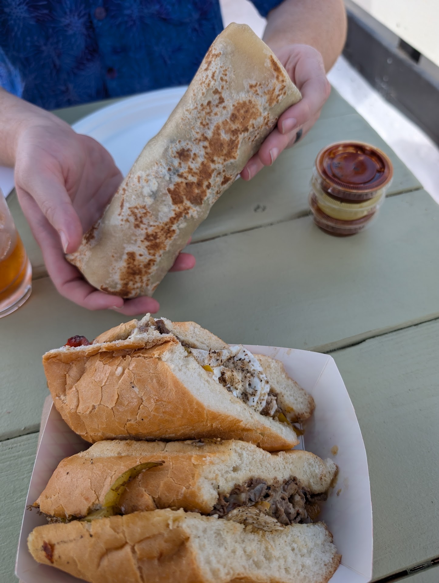 Ā Ā Ā Read moreWe tried the taco place for Taco Tues. We had a fish taco and a pork taco. Wasnāt a fan of the pineapple on the taco but they were good overall. Regular size tacos for $5 each. The watermelon Fresca drink was delicious. We also had a simple bean and cheese burrito. Itās large sized, perfect for kids to share. Chips and guacamole were very good as well. Itās self serve, plastic and paper, so nothing special there. Picnic tables and some chair circles sitting in white sand w fake turf. Thatās about it. The bar was empty until someone yelled out and said to come up if we wanted anything. We didnāt. Yes itās kid and dog friendly but the only āgameā for kids is corn hole and nothing else unless they think digging in dirty sand is fun for kids. Maybe they mean kid friendly as kids and run all around while parents drink. Overall Itās just ok. Convenient if you live nearby and want different food options. Weāve also had the Thai food and liked it very much. Not a drinker so canāt comment on...