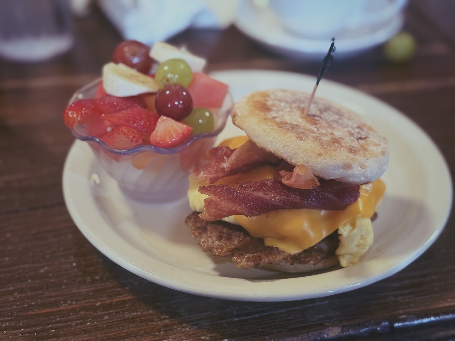 Breakfast Sandwich Stacked with crispy bacon, cheddar, and fluffy eggs on a toasted English muffin. It had that classic breakfast energy. And the fruit cup that came with it was surprisingly fresh and sweet.
