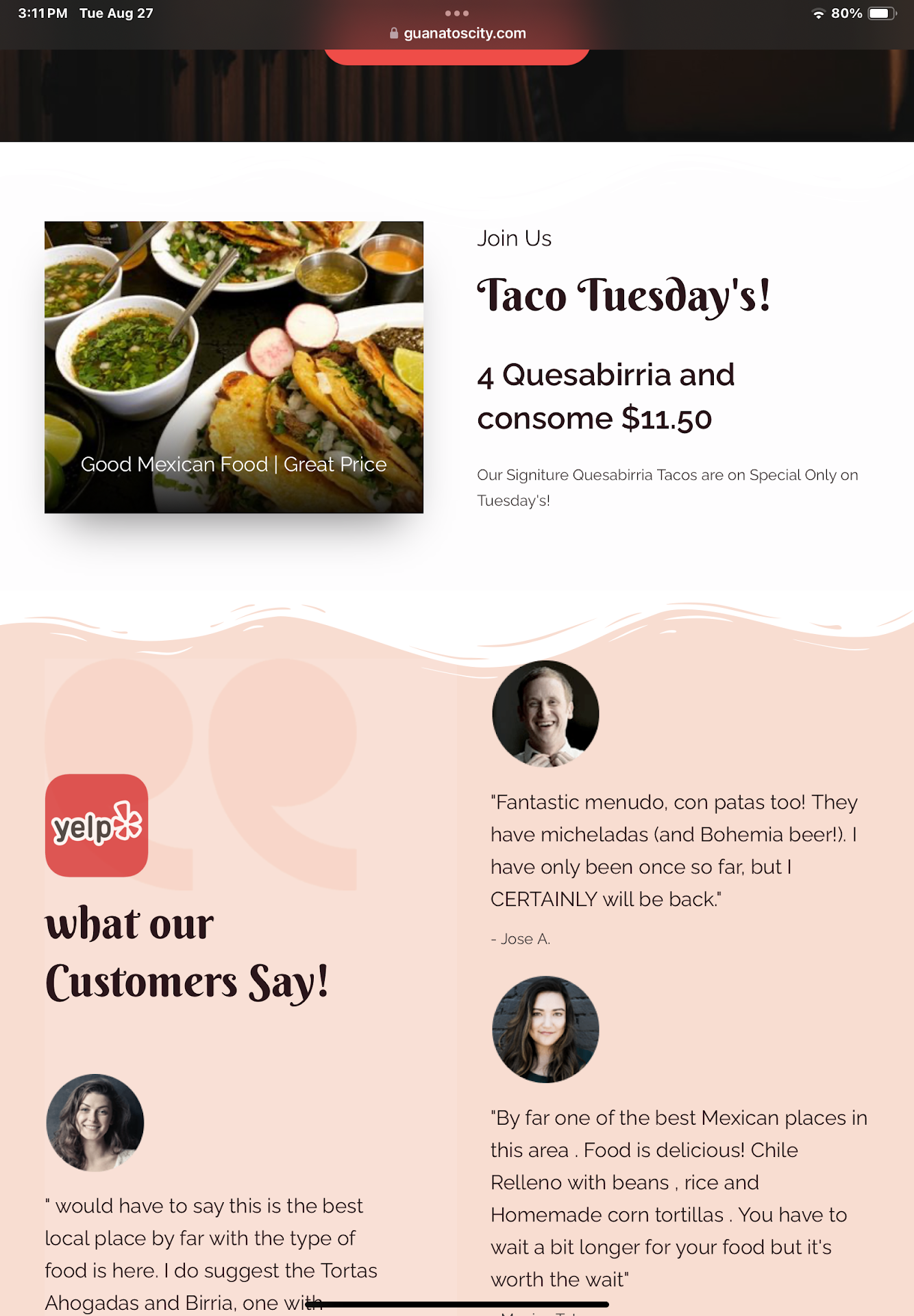 We ordered plain quesabirrias for kids and a total of 5 tacos for the adults. To put it nicely the family was so upset to wait so long that I am sure they are going to roast me later. When paying I inquired as to if this is the normal wait times. I guess two people called out and when they do this happens. I suggest cutting your losses because the food was great but this experience will be hard for me to convince the family to come back. I saw others wrote reviews on the same issue, please fix that hate to see a bad reputation to a great place.