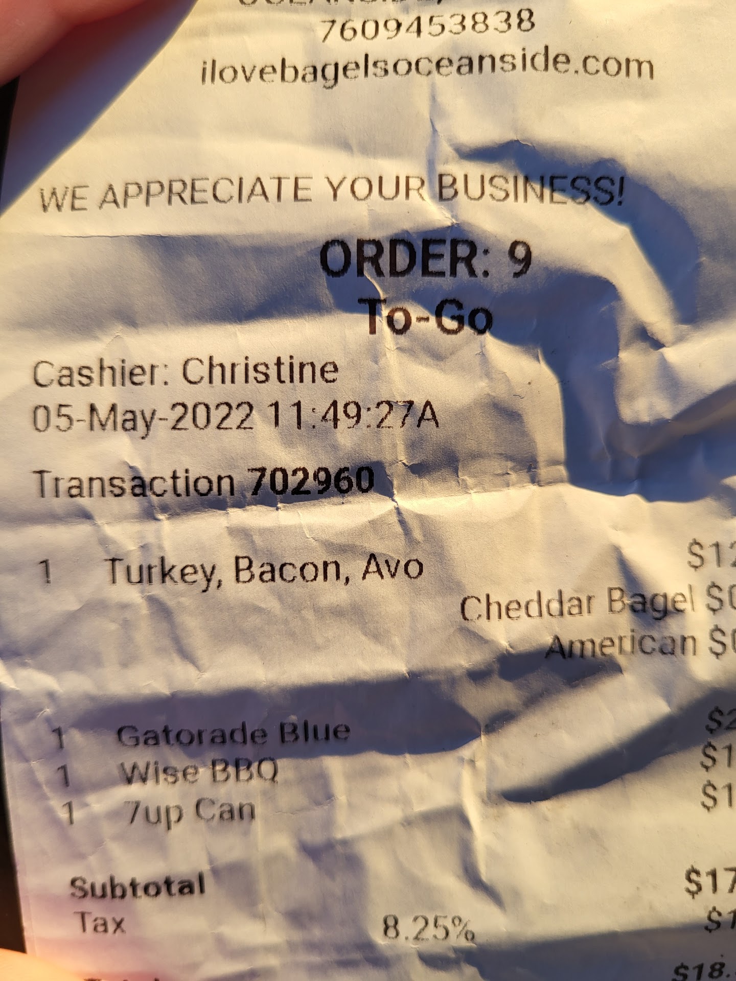 Read moreI love the turkey bacon avocado, it's the best. I come here on my lunch about 1-2x week. This visit I was very disappointed. Not by the food but by the way the food was handled. The cashier who took my order was wearing a glove on one hand. Maybe it because I've work in the food business I notice things more. But what I saw was she took my order wearing the glove clicked on the cashier screen, rang up my soda and chips. And with that same glove grabbed by bagel. Still wearing that same Glove takes another customer orders gives her her change and grabs her 2 bagels. With that same glove goes to the food prep and starts making the other customers orders. She cross contaminated our orders and the food prep. Food safety and handeling should be priority. As we the customers help...