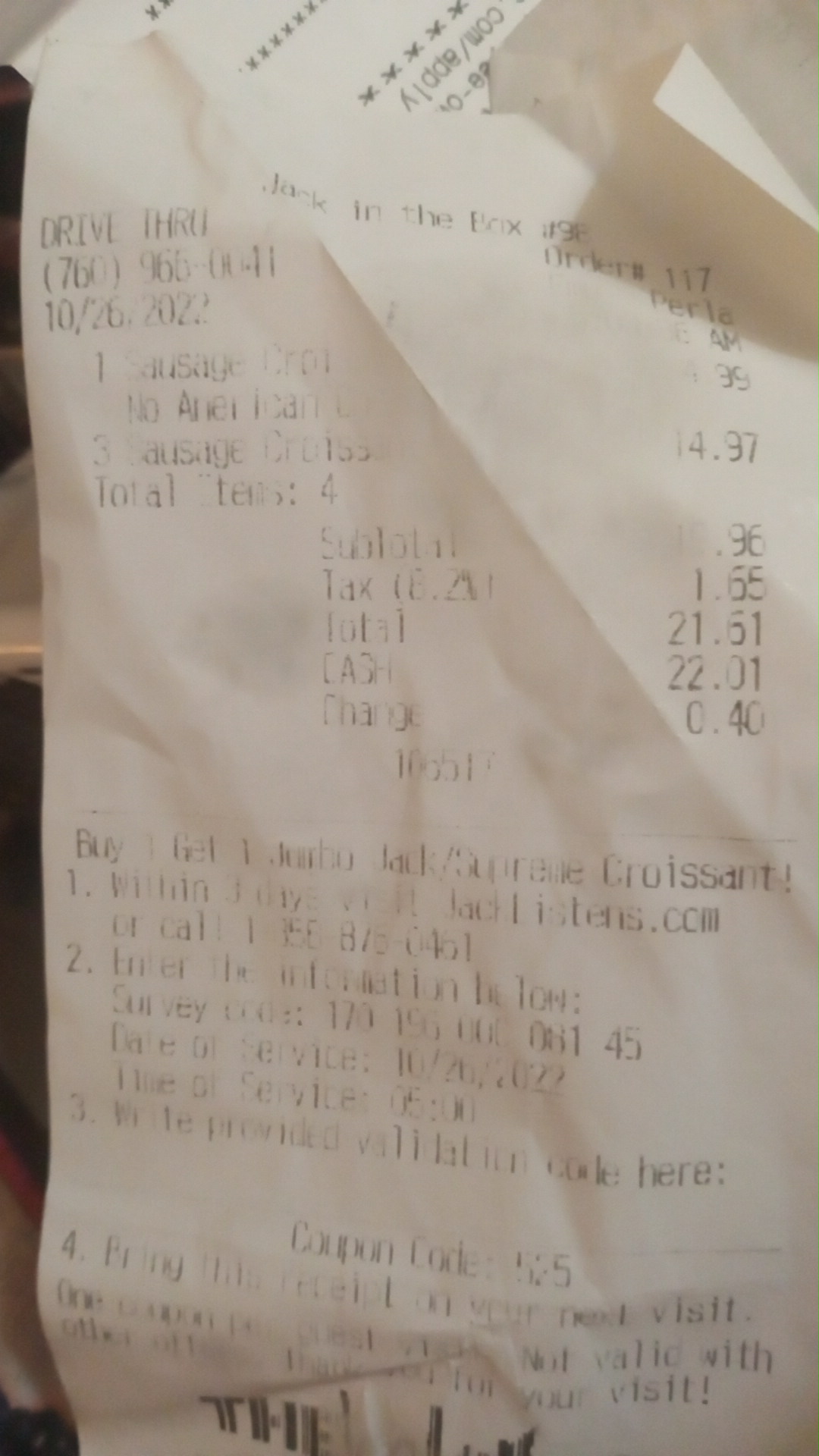 Pretty frustrating the app doesn't let you know when the 24 hour location is no longer accepting orders because there's no staff because of a break. Completely understandable to have a break. However, don't allow online orders to go through and have a pick up time that cannot be honored. The staff there is not able to cancel and refund the order you have to request it through the app. There is no refund request option there is an "inquiry" to reach out to support for them to "consider" your refund and you have to go through a long questionnaire that by the end of it does not load shows a request error page every single time (went through it on the app and a web browser on the computer) and it doesn't go through. If you take the survey and leave bad remarks it also doesn't load but if you leave good remarks it loads just fine. Pretty insane. Wasted time and money. Would recommend to call before placing your mobile order to make sure your order can actually be filled. Nothing against the location or the staff but just jack in the box company and how poorly their customer support and mobile app is ran. Honestly feel frustrated for the staff because I'm sure I'm not the only one that's experienced this issue. Shouldn't be that hard for the company to have times where mobile orders are not allowed...
