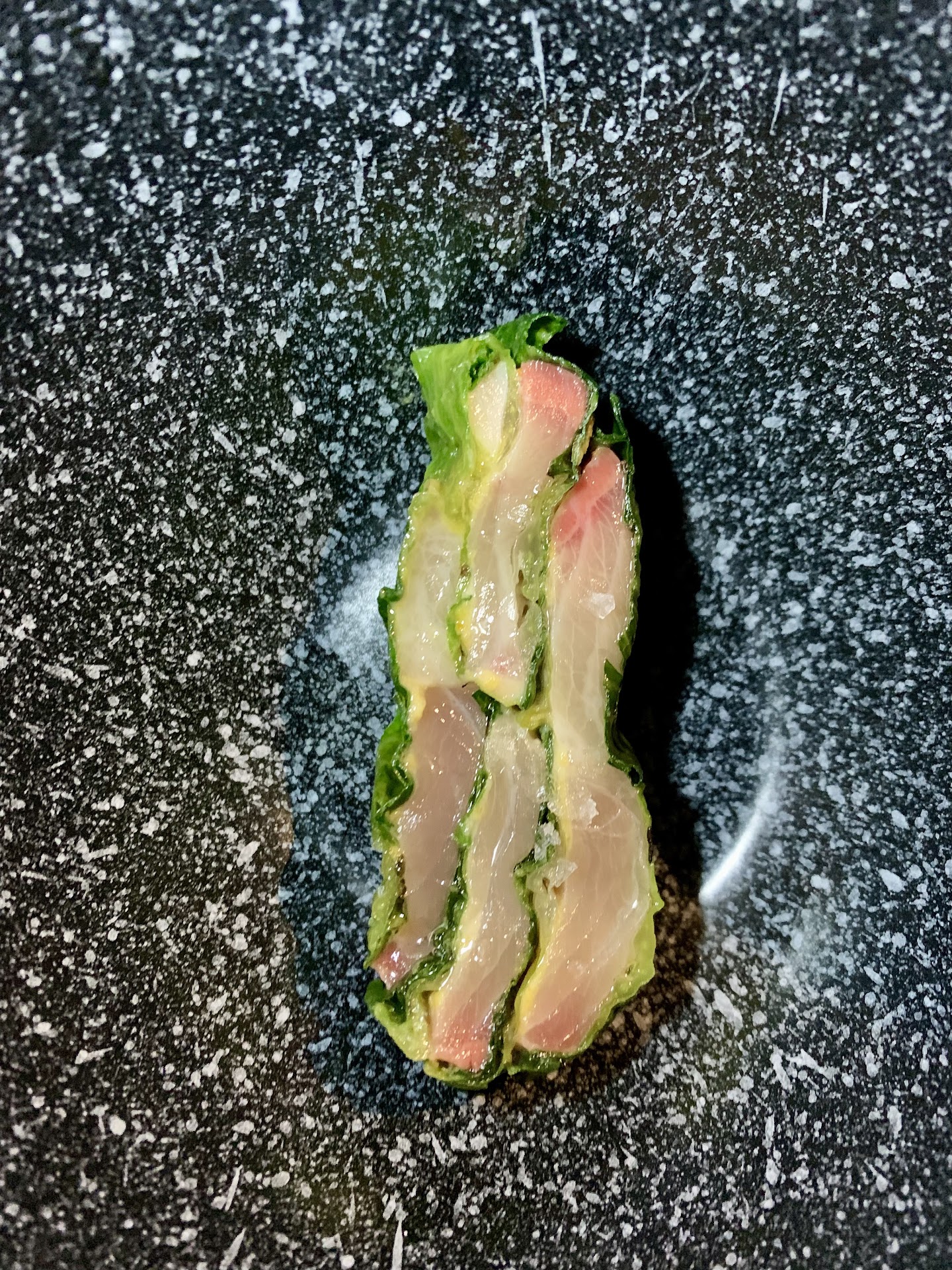 The first course was a Japanese Hamachi wrapped in lightly grilled romaine lettuce with Kumquat koshu and macadamia.