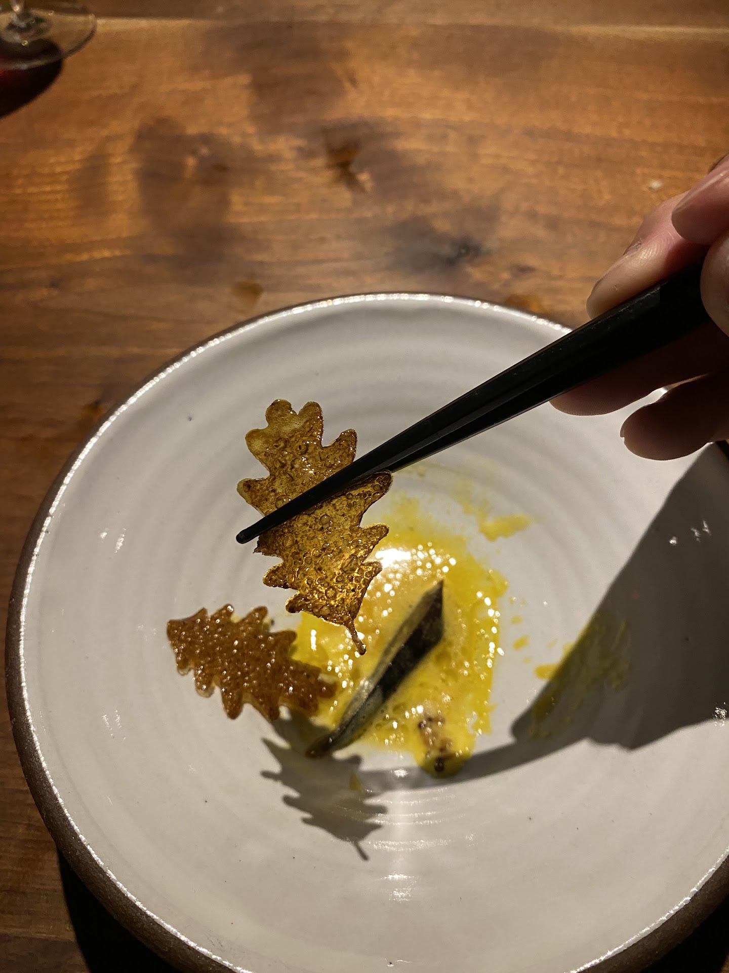 The sixth course was one I couldn’t stop myself from raving over. Japanese scallops are lightly seared on one side and left raw on the other served with pickled shiitake mushrooms and a mustard seed egg yolk sauce. The whole dish is draped in a crispy fried piece of dehydrated mushroom dashi. This could be the best scallop bite I’ve ever tasted. Perfectly delicate and each bite is packed with so many harmonious flavors.