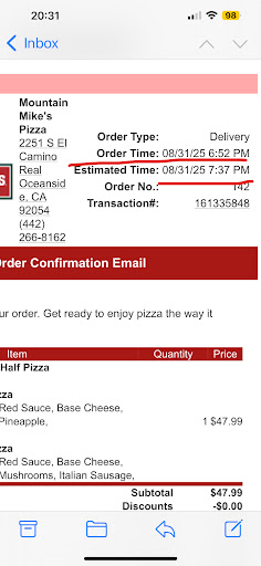 Hereās what happened: ⢠I waited patiently, but by 8:16 PM (an hour and 24 minutes after ordering) I had to call the Mountain Mikeās Carlsbad/Oceanside location directly to ask what was going on. ⢠From the DoorDash order log, itās clear they didnāt even confirm my order until the same time I calledā8:16 PMāas if they had forgotten about it entirely until I reminded them. ⢠The DoorDash driver finally picked up the pizza at 8:38 PM, which is not the driverās fault, but shows how badly the restaurant delayed making my order. ⢠When the pizza finally arrived, it was cold.