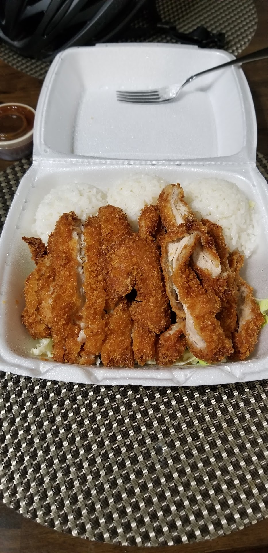Ordered take out at lunch of the meat trio plate and the chicken katsu plate as well as 4 spam musubis. All the food was delicious and they didn't forget to include the katsu sauce. Very nice service. They have a little aquarium with lots of fish that my toddlers like watching. It's next to the drink station.