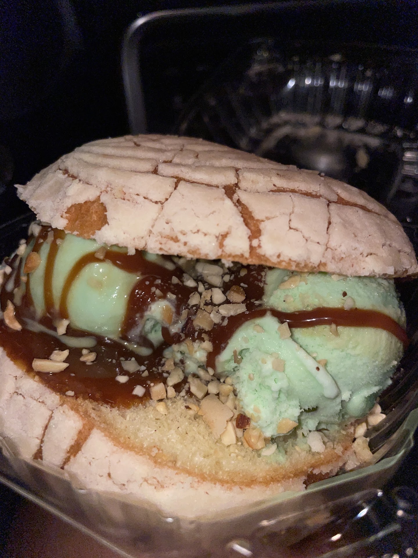 Pictured is a Concha with Pistachio Ice Cream, caramel and nuts.