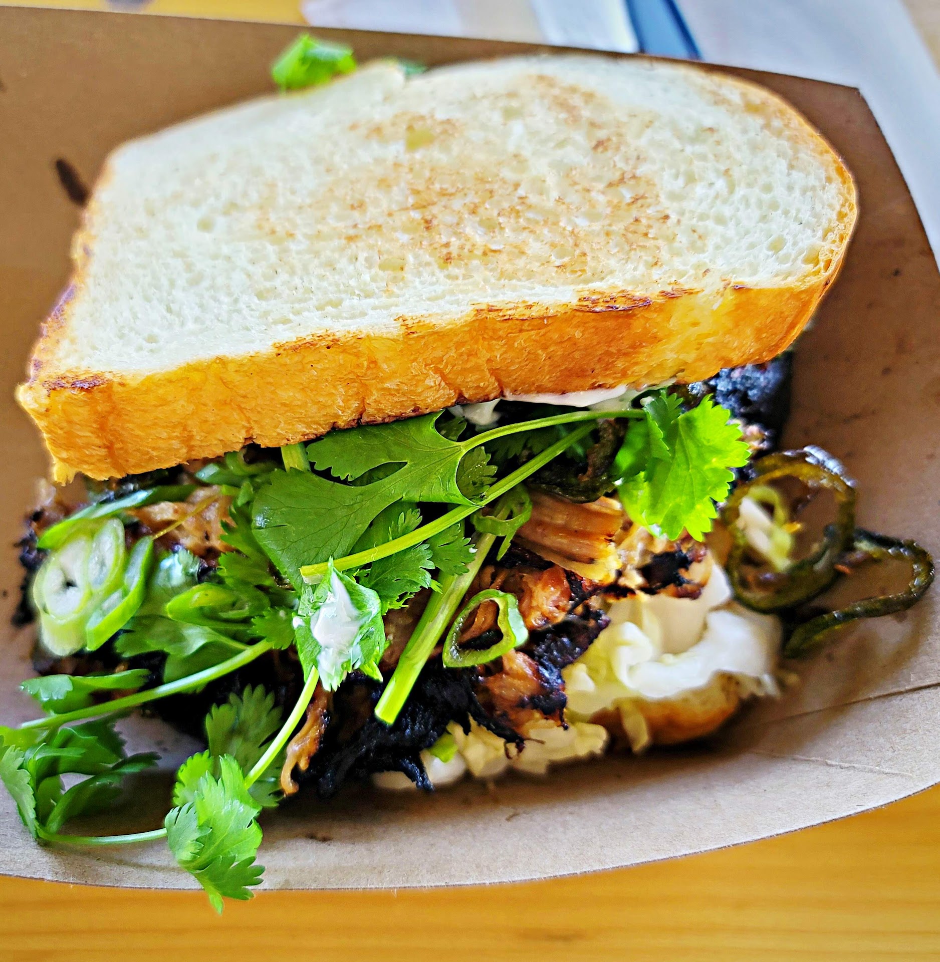 Today's catch was Opu, so we tried that in the fish taco and it was so good. It's a more buttery fish, and they seasoned it so nicely so the fresh original fish flavor still came through. The baja style shrimp taco had such a nice beer batter too. One of the specials today was a kalua pork sando using bread from their neighbors @hokkaido_bread_company and we added fried jalapeƱos to it. Perfectly smoky, juicy kalua just the way I love it.