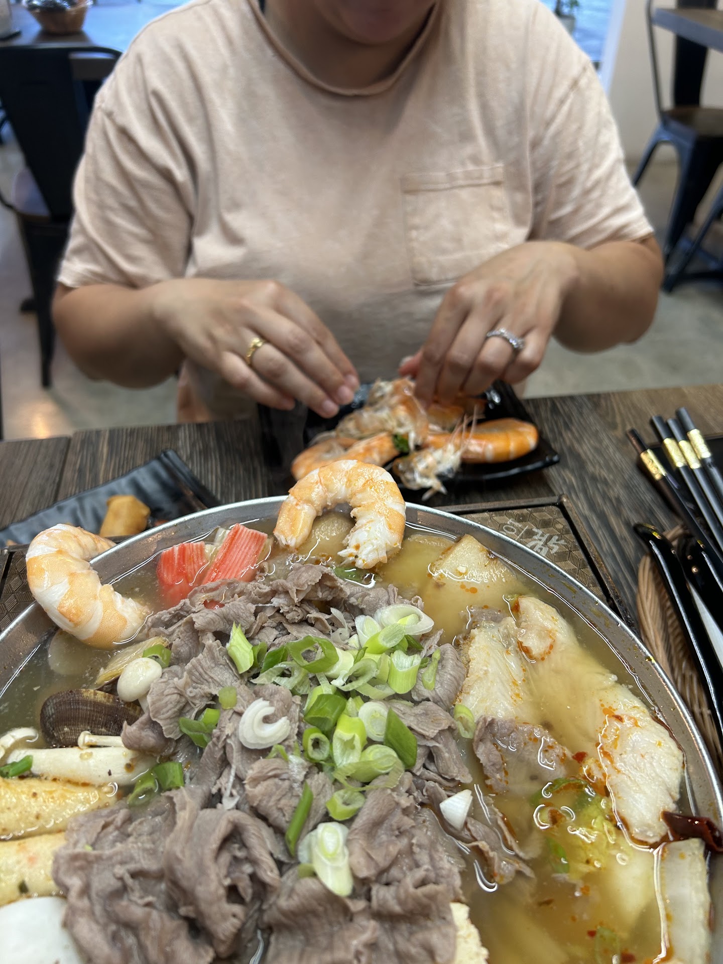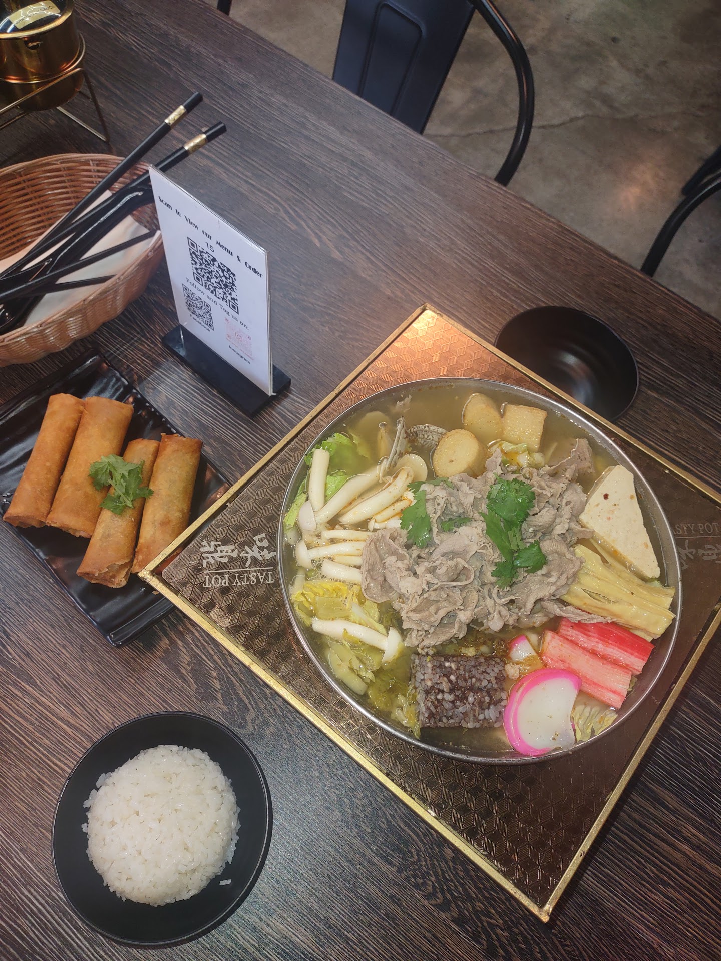 Read moreSo me and my boyfriend have come down here a few times, at first we wanted to try something new but after awhile I'm happy to say we found our forever date spot. Hot pots here are delicious and the sweet tea they serve as complimentary helps so much if you get anything spicy. So first we tried the lamb pot, it was okay but would've been better if lamb was seared not boiled, tho everything else was absolutely delicious including the pork egg rolls. We tried the pork second, it was better but the best bowl we've had is the vegetable one. Everything is so good, we also really love the pork egg rolls and the quail eggs! The mini sausages they're good to me, my partners not a fan though 🤣 I do love their chili oil, it especially hits when you dip it in the oil a little bit, bite into the egg roll and eat a quail egg. Literally an explosion of flavors in your mouth. Not to big on the kimchi dumpling as it's more doughy but the ingredients packed inside definitely taste delicious.